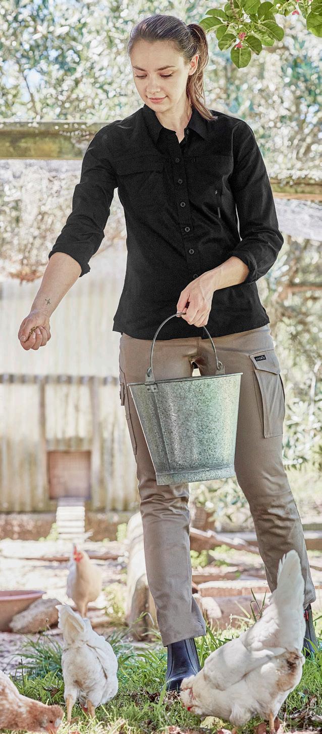 • Tonal contrast button stitch and hole • Inverted pleat in back yoke for comfort • Womens style features semi-fitted open neck ‘Y’ front design