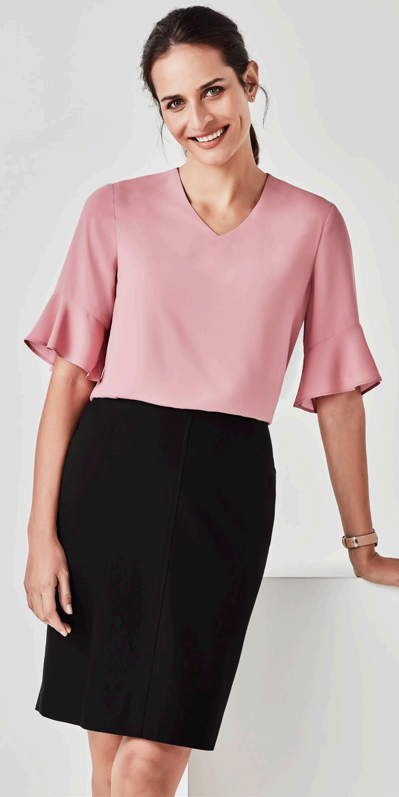 FEATURES Soft fluted sleeves with seam designed to sit above elbow • No back neck opening - easy slip on style • Straight front and back hemline - can be worn tucked in or out