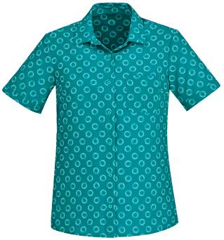 FEATURES Double bust button for added modesty • ¾ Drop shoulder sleeves, no button cuffs • Designed to be a relaxed fit through the bust and waist • Soft collar is designed to sit open at base of neck • Can be worn tucked in or left out • Straight hem • Short sleeve style features extended raglan style short sleeves and side splits at hem