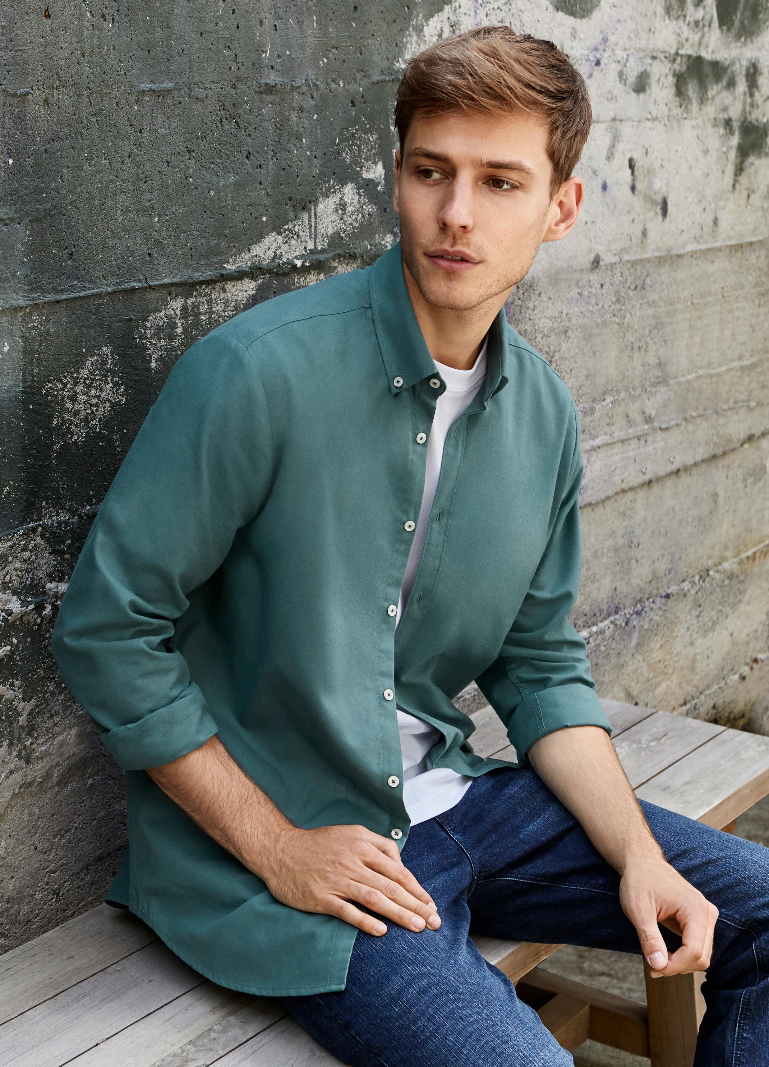• Modern button-down collar, chest pocket and metal look buttons • Matching top-stitching details for durability and sleek appearance • Can be worn tucked in or out