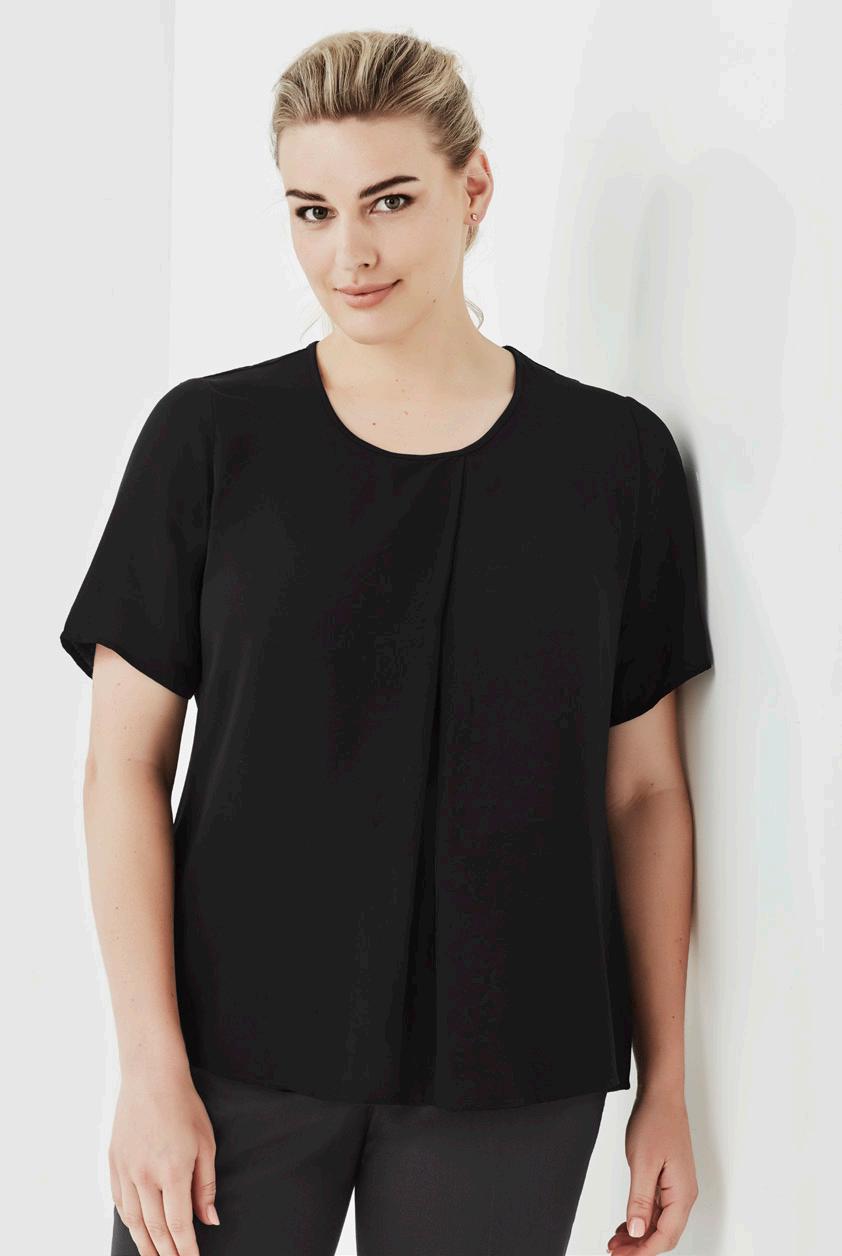 FEATURES Soft flowing, flatters without clinging • Pleat fold neck detail is slightly offset to allow space for company logo • Looser fitting style that skims over the tummy • Can be worn tucked in or out