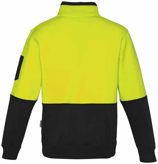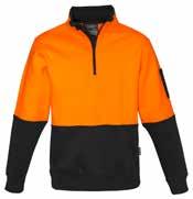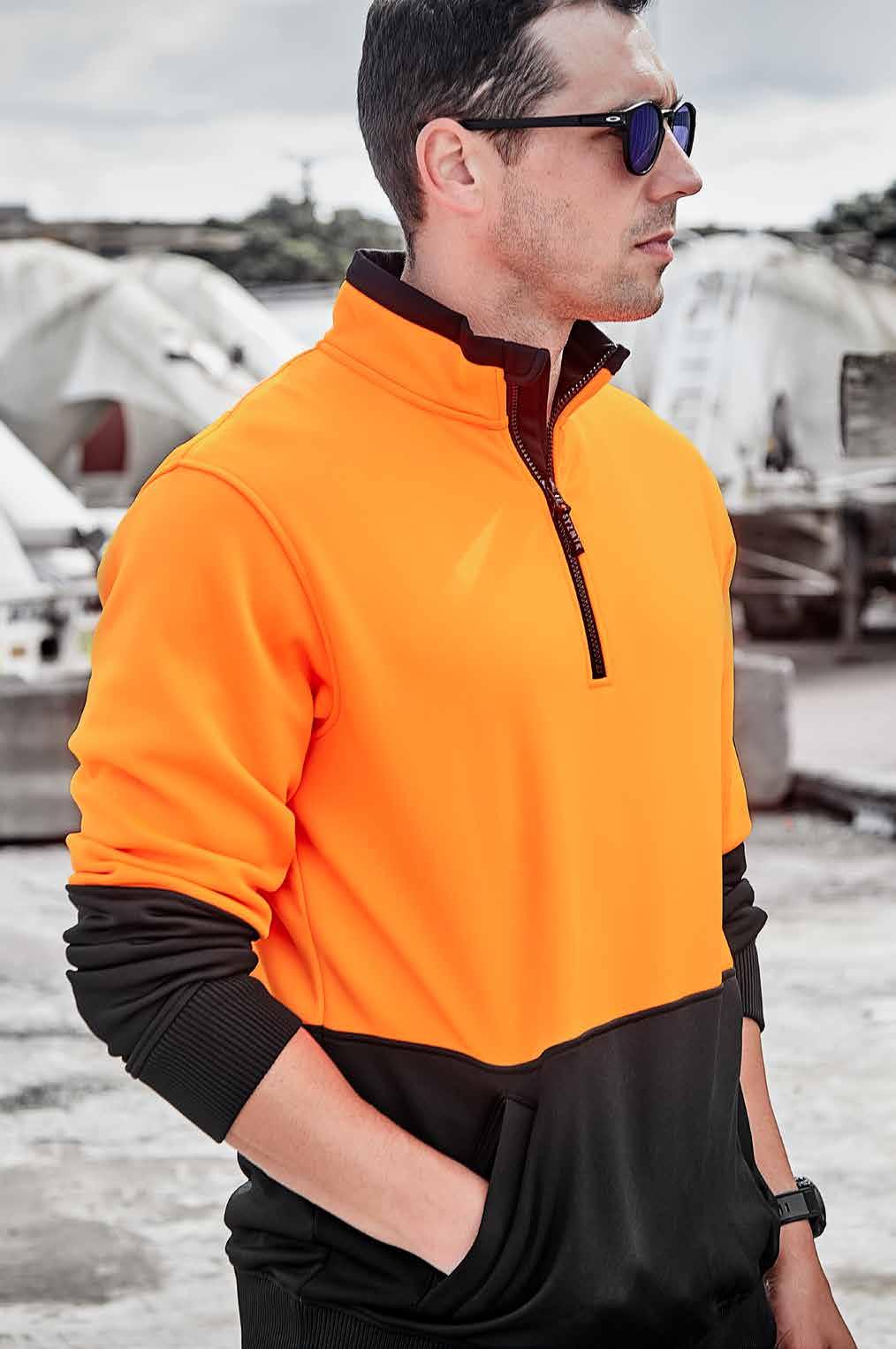 Warm soft 320 gsm low pill fleece lining perfect for cold days Half zip construction so you can let the air in when you’re hot and block the wind out when you are cold Two kangaroo pockets with zips so your tools, keys or other valuables never fall out Woven double pen partition on the arm Chin guard for increased comfort