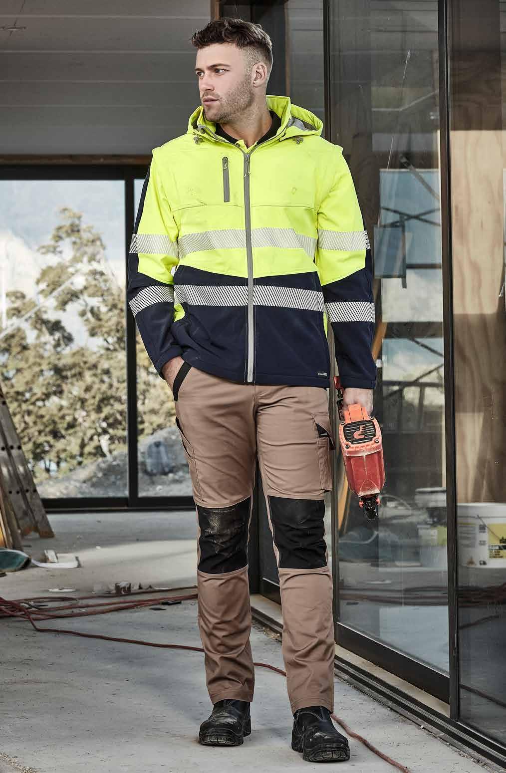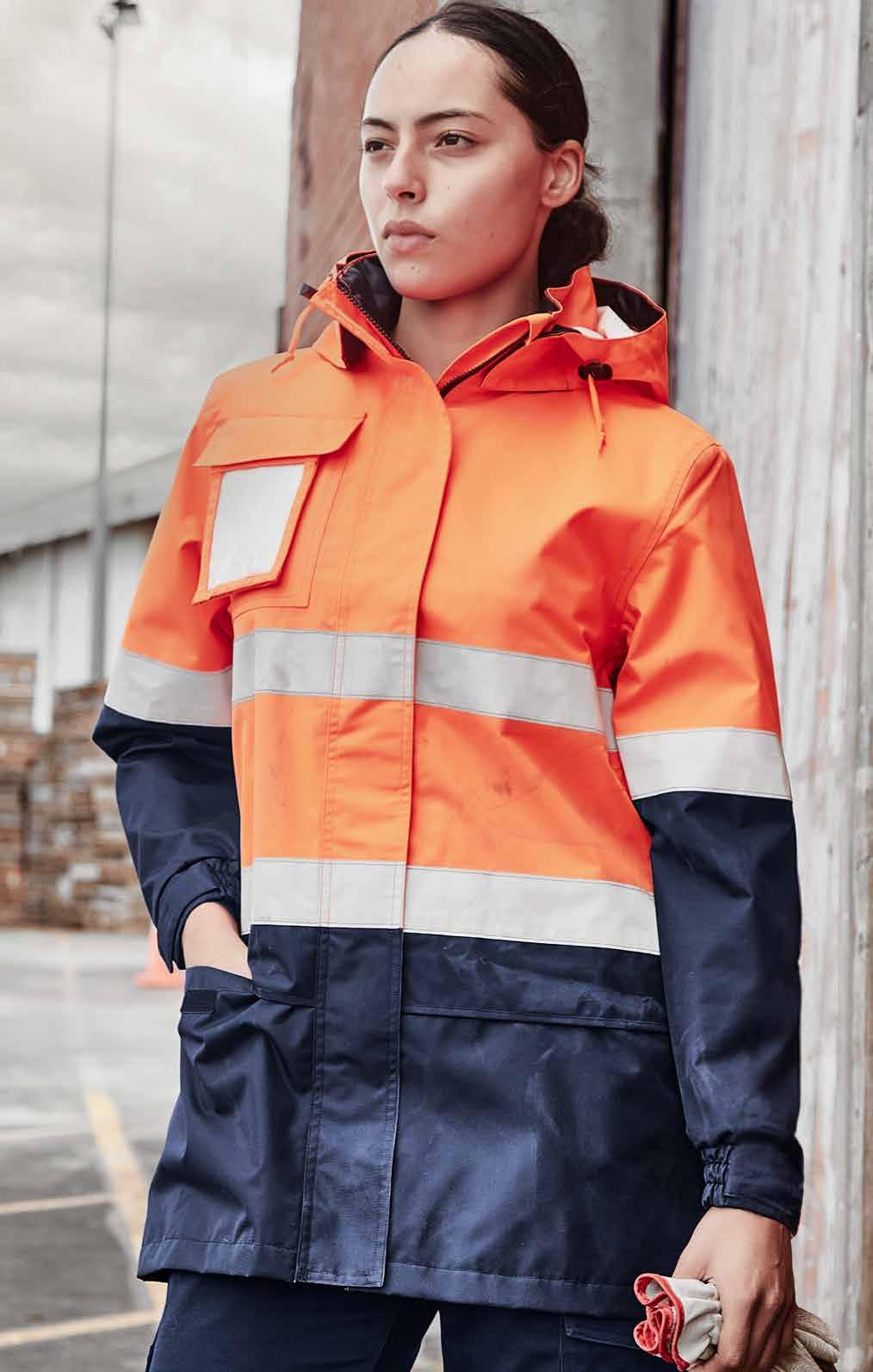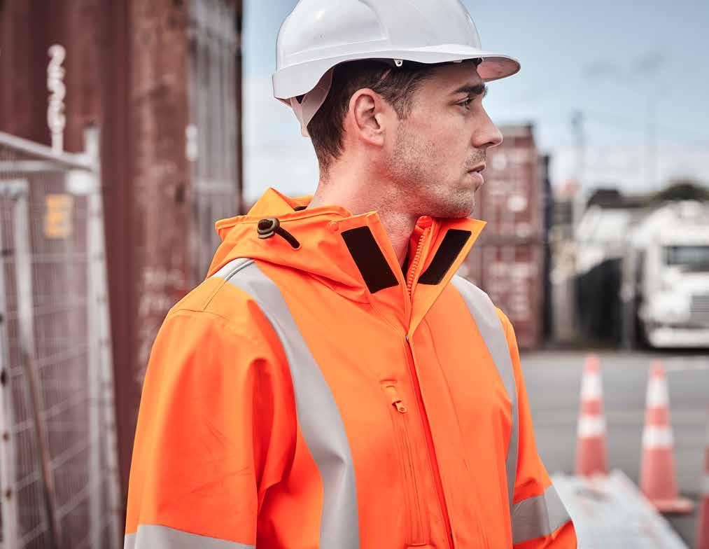 NSW Rail compliant design High waterproof rating to provide protection in heavy rain conditions Waterproof rating 20,000mm Neoprene storm cuff to create a comfortable waterproof seal Adjustable hood made to fit hard hats Hood features a hardened peak to keep the rain off your face Rivets at key stress points for increased strength High frequency welded seams for waterproof protection at all points Longer length for greater rain protection Twin hoop Bio Motion tape configuration improves recognition of human shape at distance Two front hip pockets with waterproof zips to keep your things dry One chest mobile phone pocket with waterproof zip