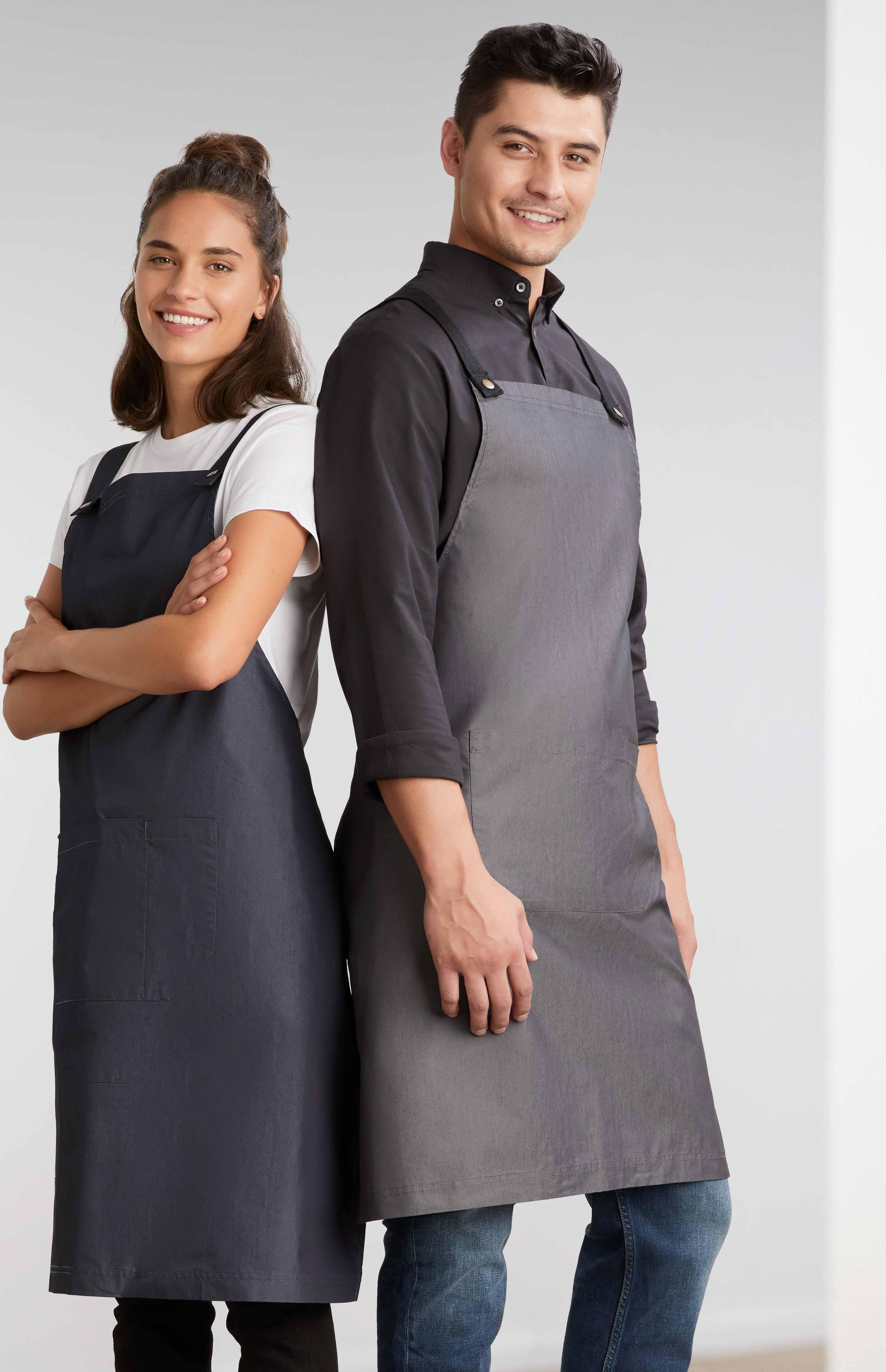 - Mandarin collar with apron tab to hold apron in place