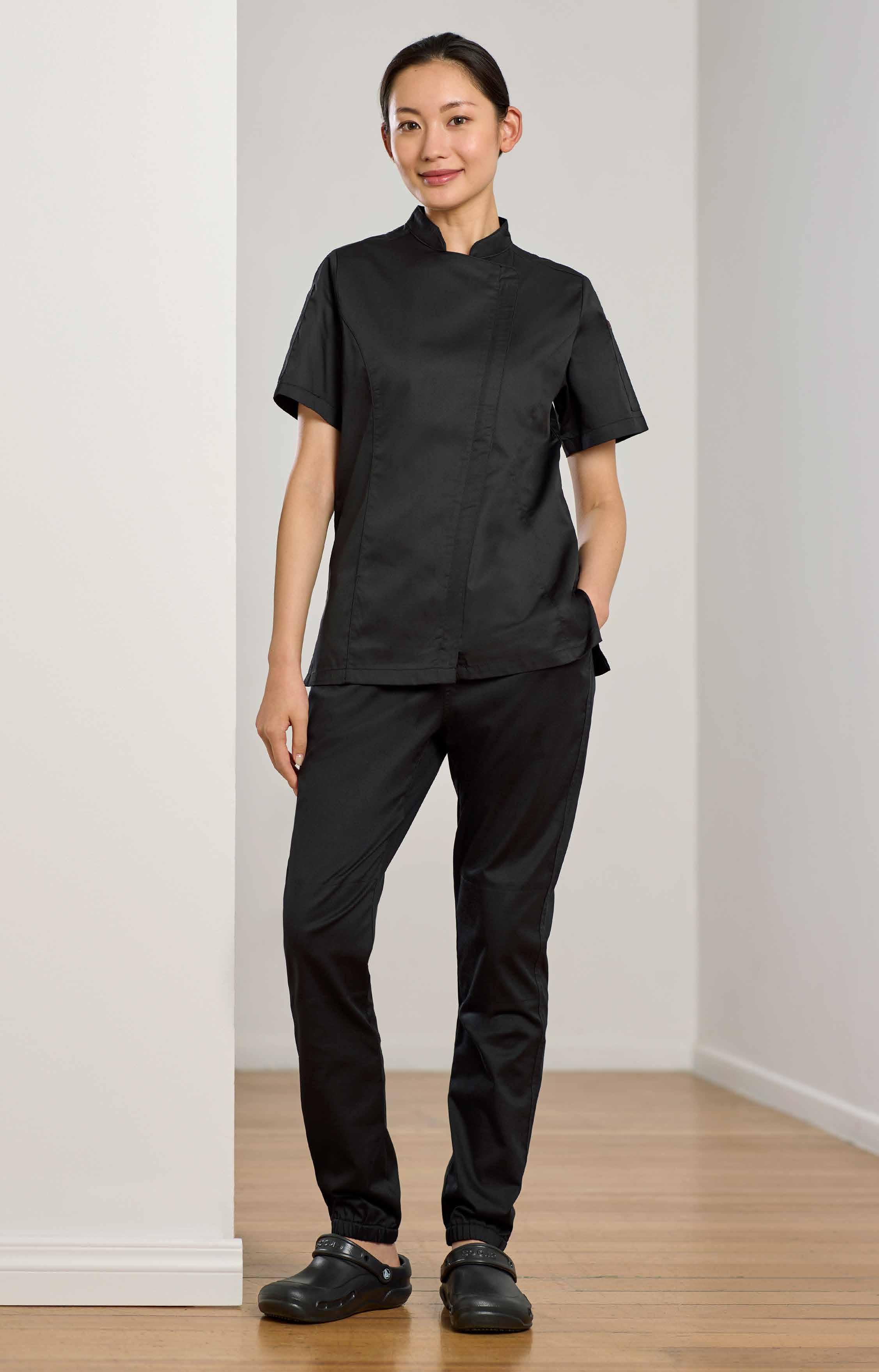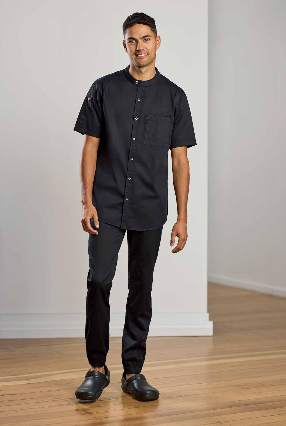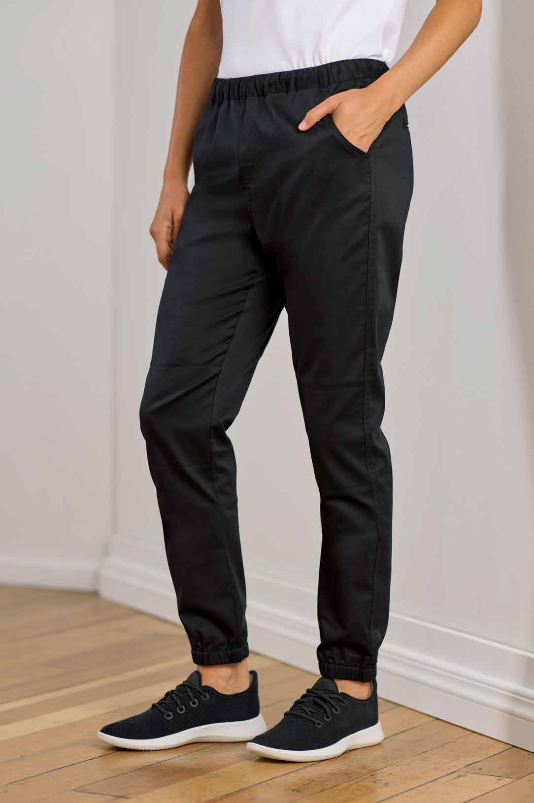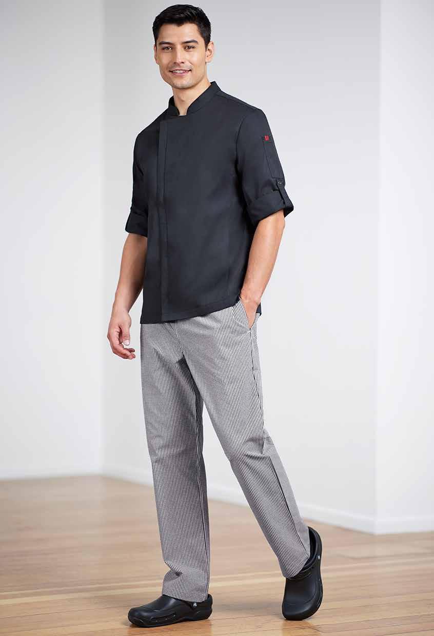 A modern pull-on elastic waist jogger in a lightweight stretch fabric, these pants bring both functionality and on trend styling to the kitchen. Keeping you looking and feeling cool.