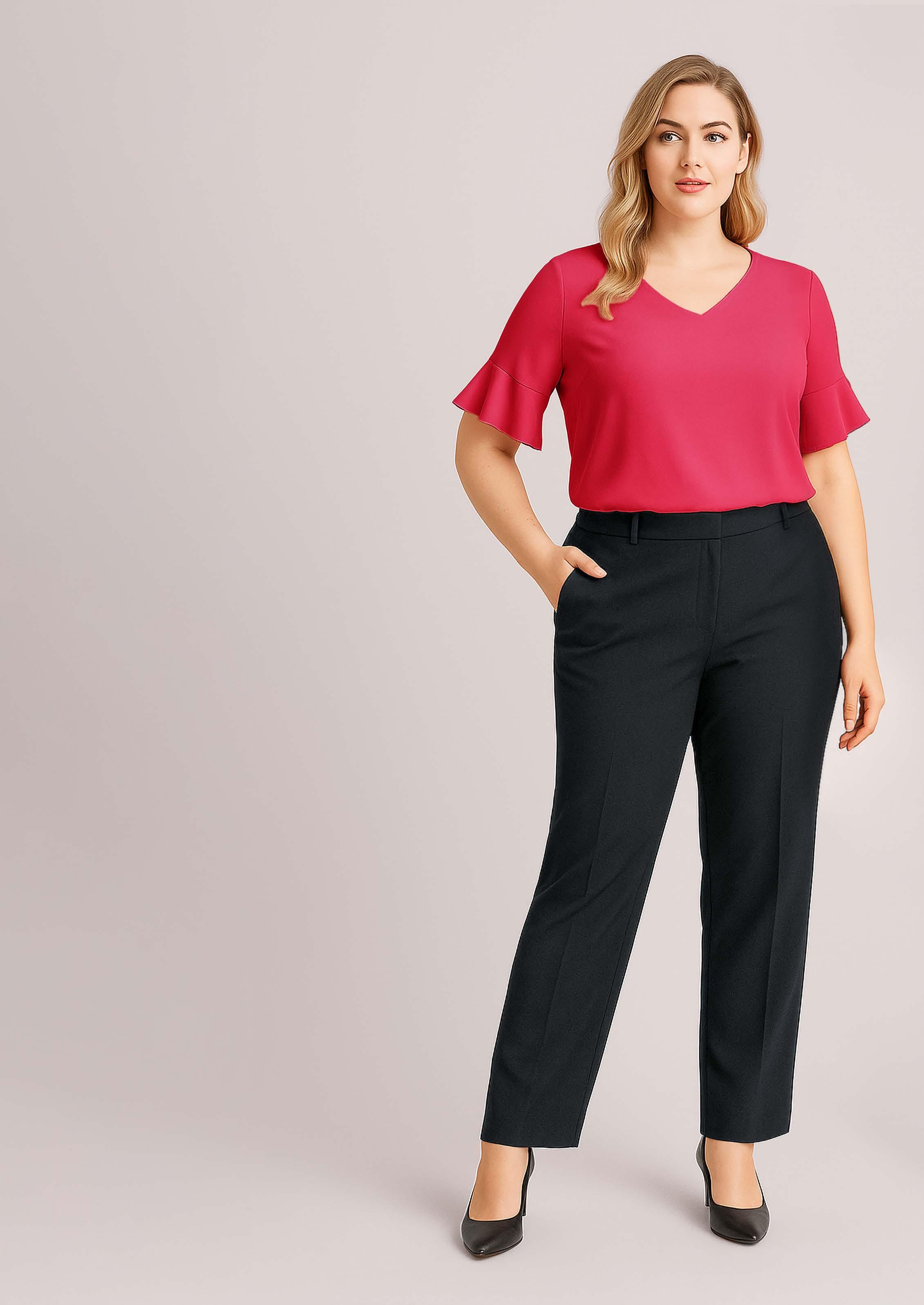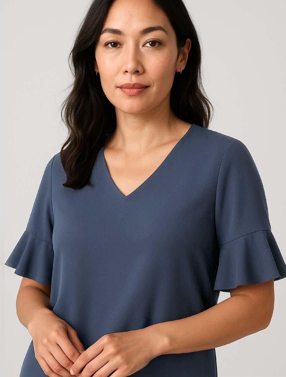 Easy slip-on style top with soft fluted sleeves. Straight hem cut, wear tucked in or out.