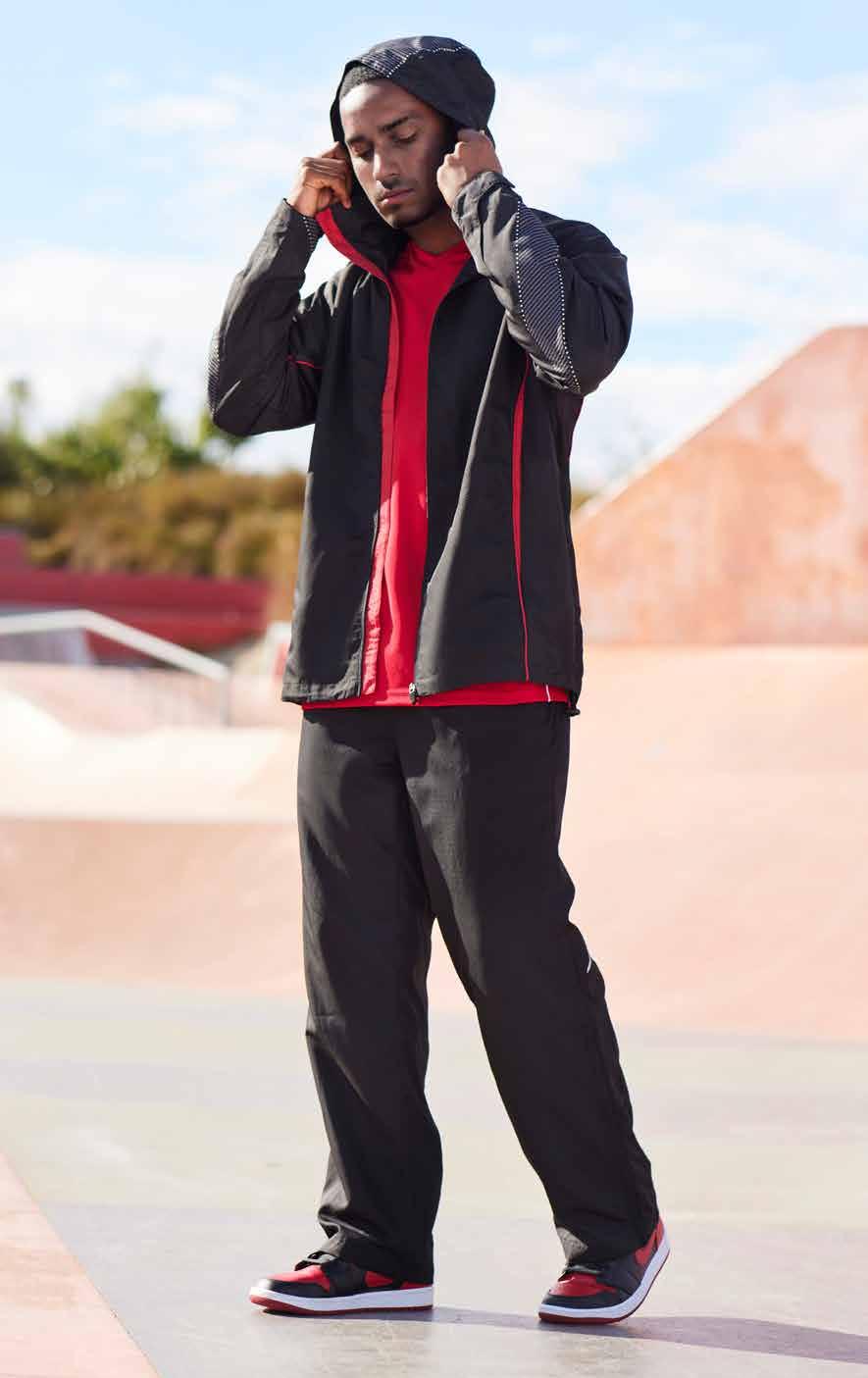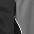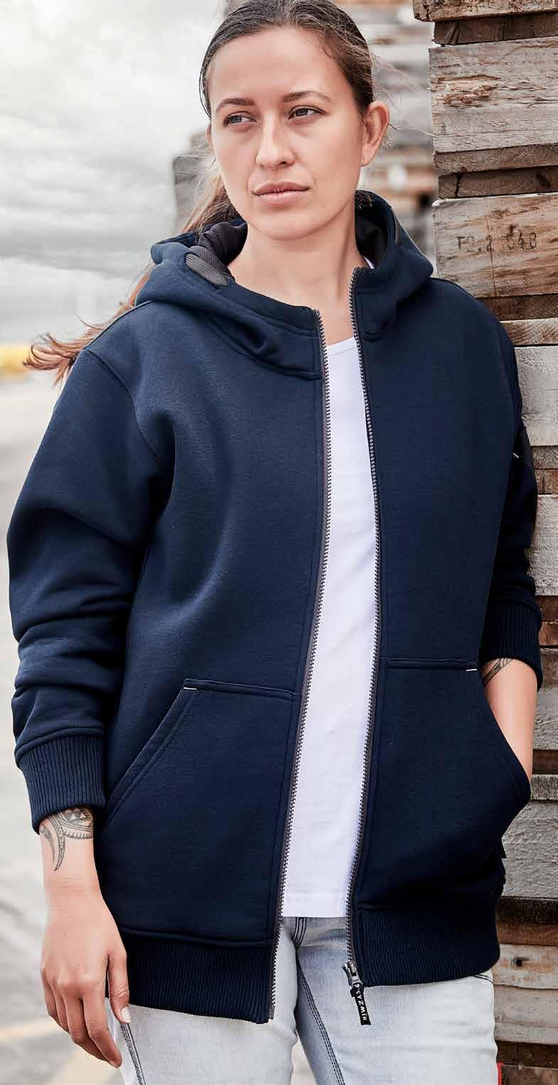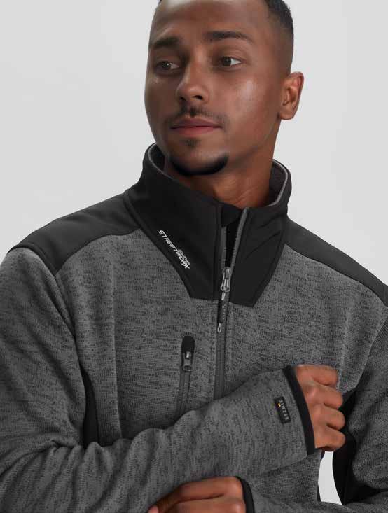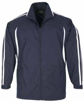 FEATURES Bar tacked reinforcement on pockets and splits • Mens features asymmetrical front with full length zip and ring-snap fastener closure at neck