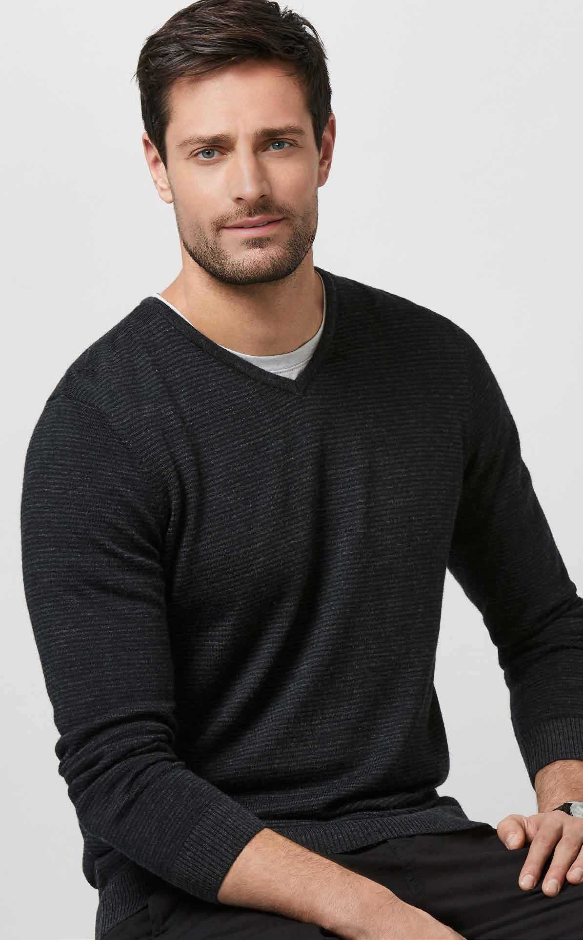 FEATURES Lightweight space-dye effect marled knit • Two-piece self fabric collar • Grown on placket • Side splits at hem • Mens style includes loose pocket