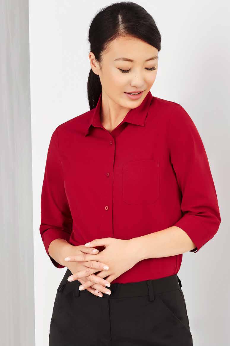 • Patch pocket on left front chest with pen partition • Band collar • Straight hemline with side splits for movement • Womens features asymmetrical front with ringsnap fastener closure