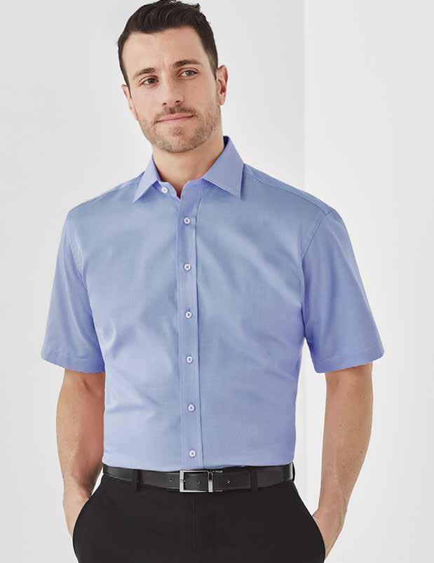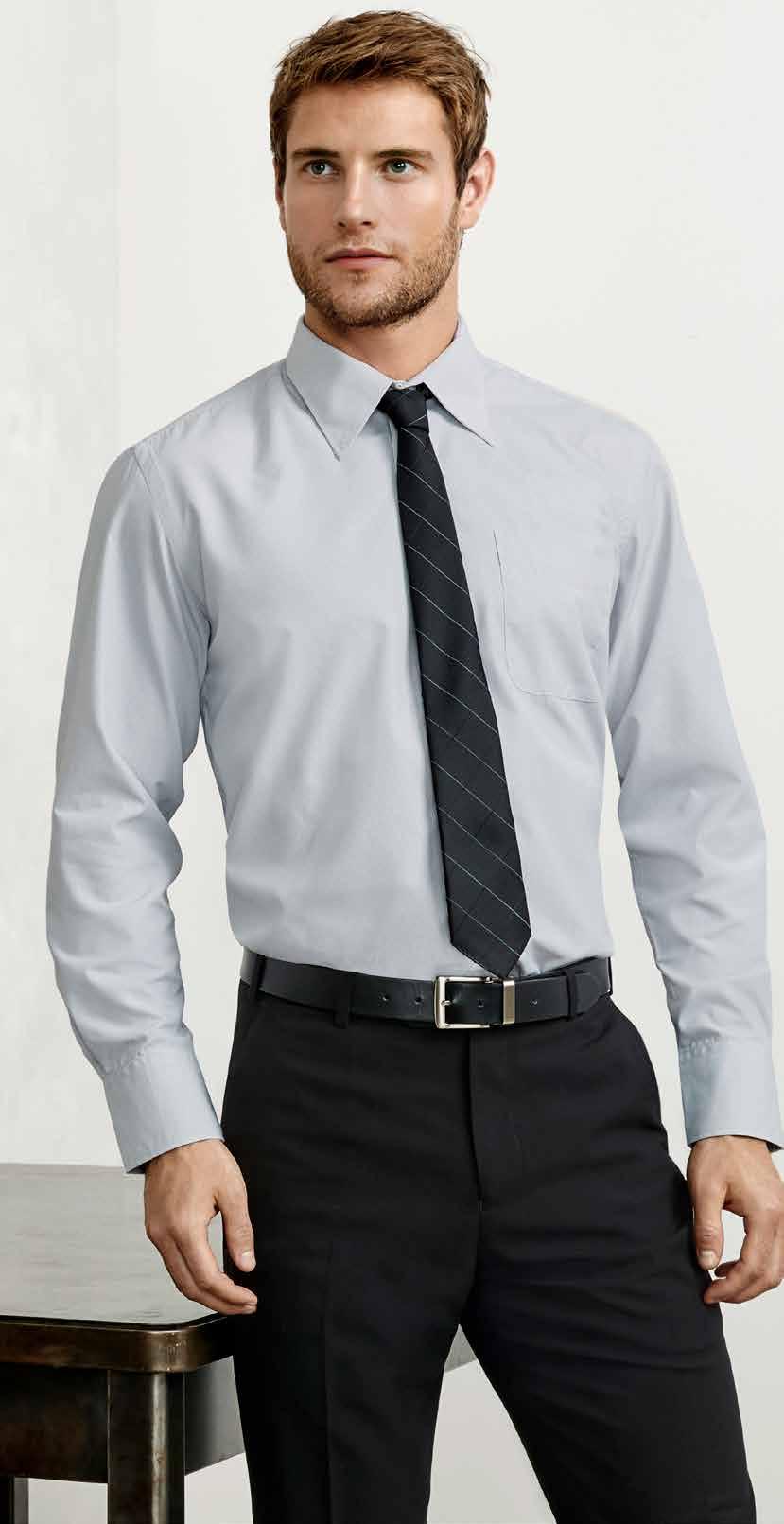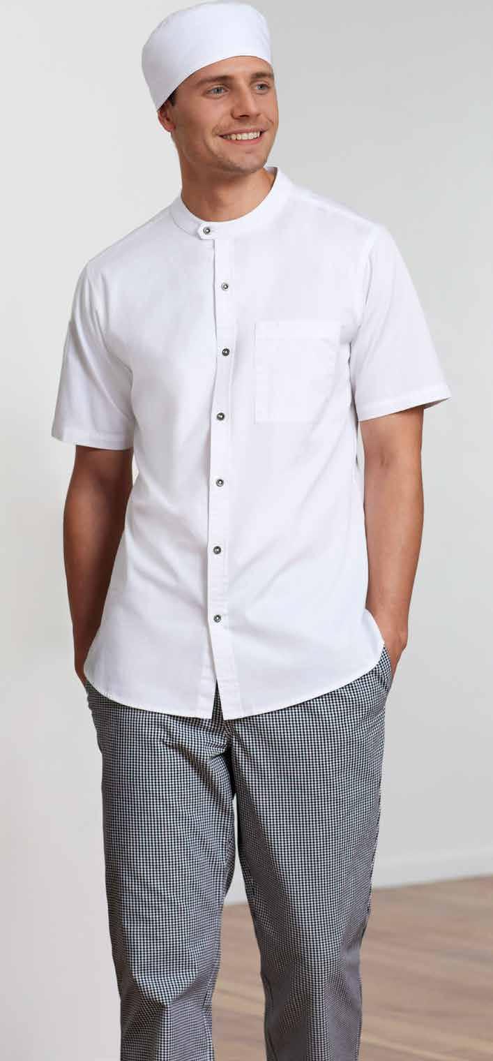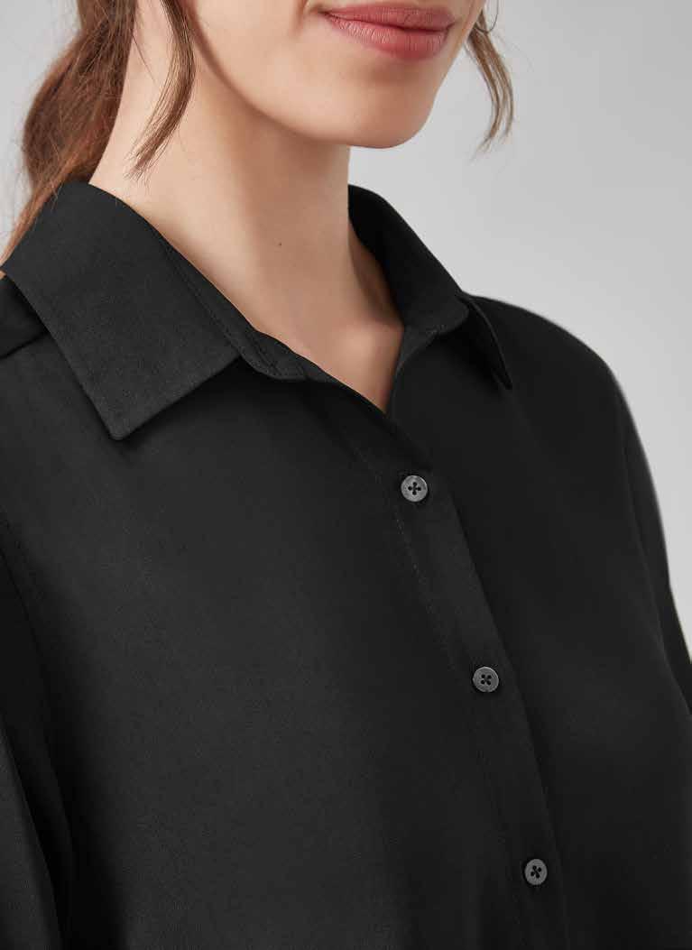 FEATURES • Two-piece self-fabric collar • Clean modern placket • Side splits at hem • Mens style includes loose pocket and concealed button down collar