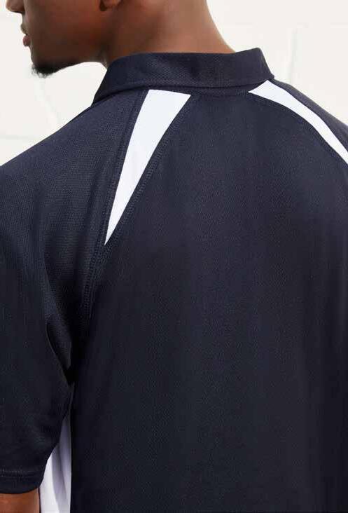 FEATURES Honeycomb weave with stretch elastane • Flat knitted collar with contrast button placket • Side panels with dynamic contrast piping • Unique print features on torso, sleeve and back neck to accent your logo • Longer length for added coverage when moving • Mens style includes loose pocket