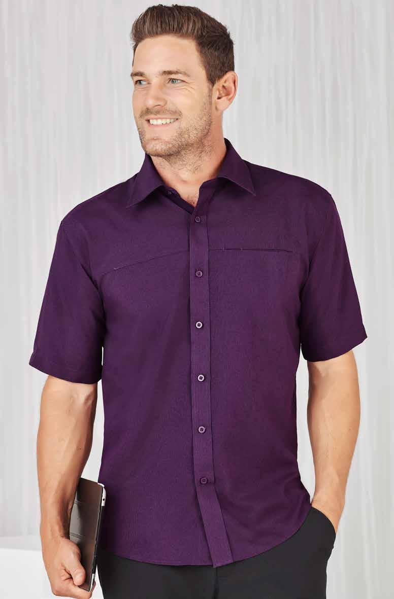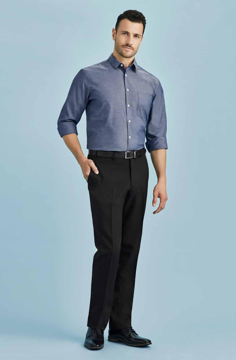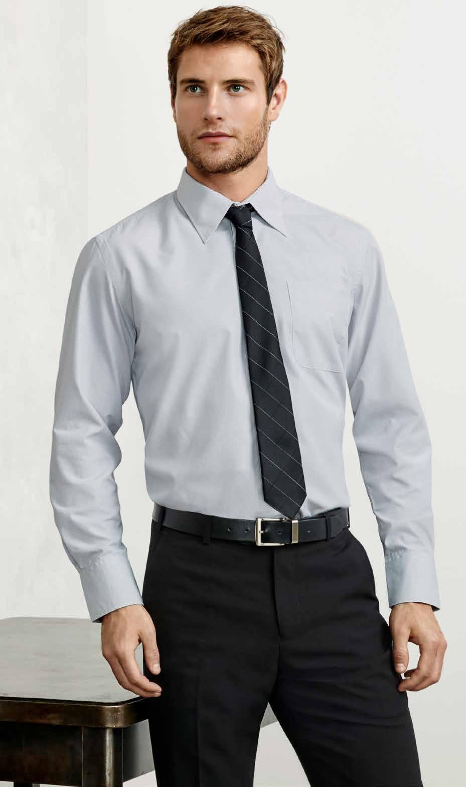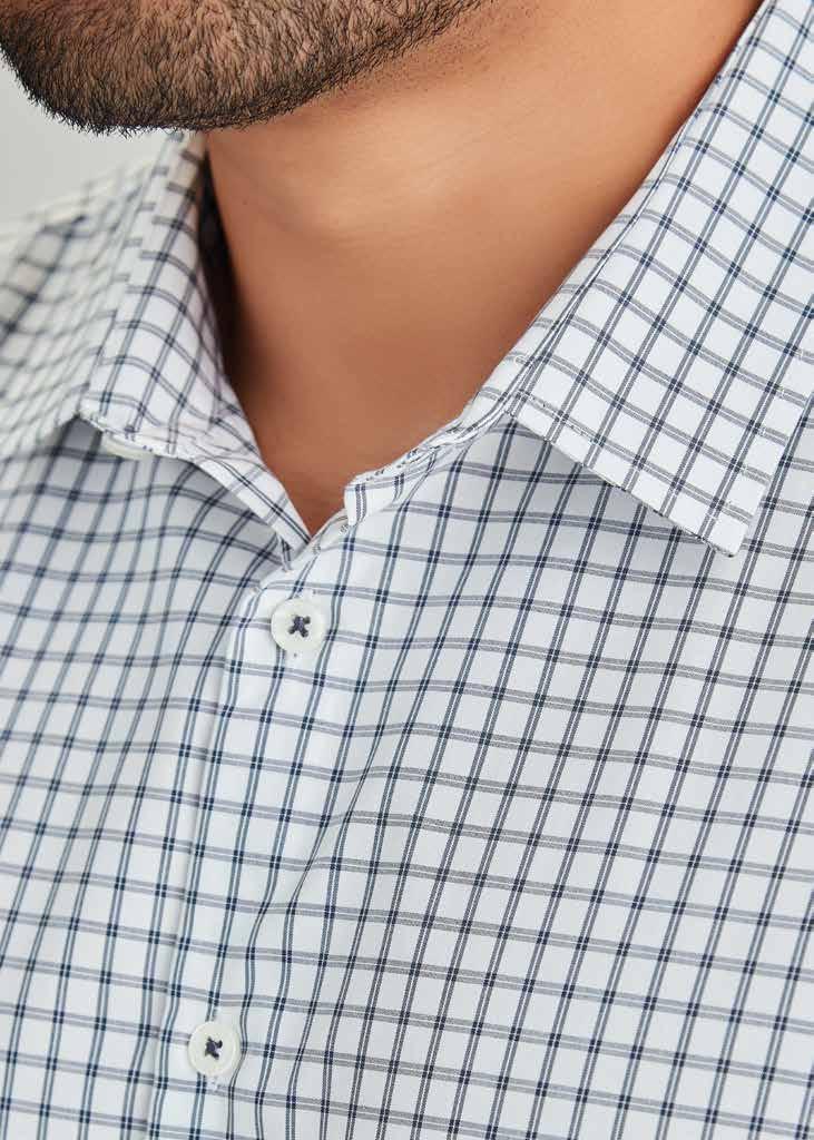 FEATURES • Two-piece self-fabric collar • Clean modern placket • Side splits at hem • Mens style includes loose pocket and concealed button down collar