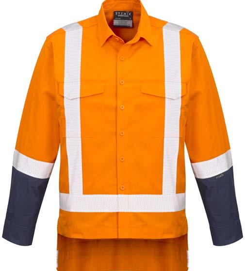 150 gsm midweight cotton twill to keep you cool while still being tough enough for any job VIC Rail compliant tape configuration and orange shade Bio Motion arm taping for improved recognition of human shape at a distance Underarm and upper back mesh vent inserts Two chest pockets with button closures and pen partition Fade tested
