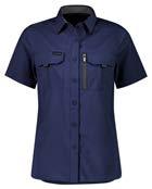 170 gsm midweight cotton twill to keep you cool while still being tough enough for any job Upper back mesh vent inserts Darted for feminine fit Triple stitched seams Reflective tape in hoop configuration Two chest pockets with button closures and pen partition Extended curve shirt back