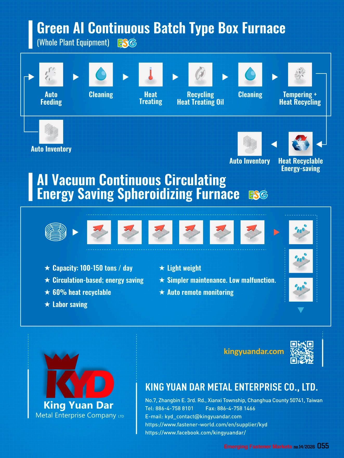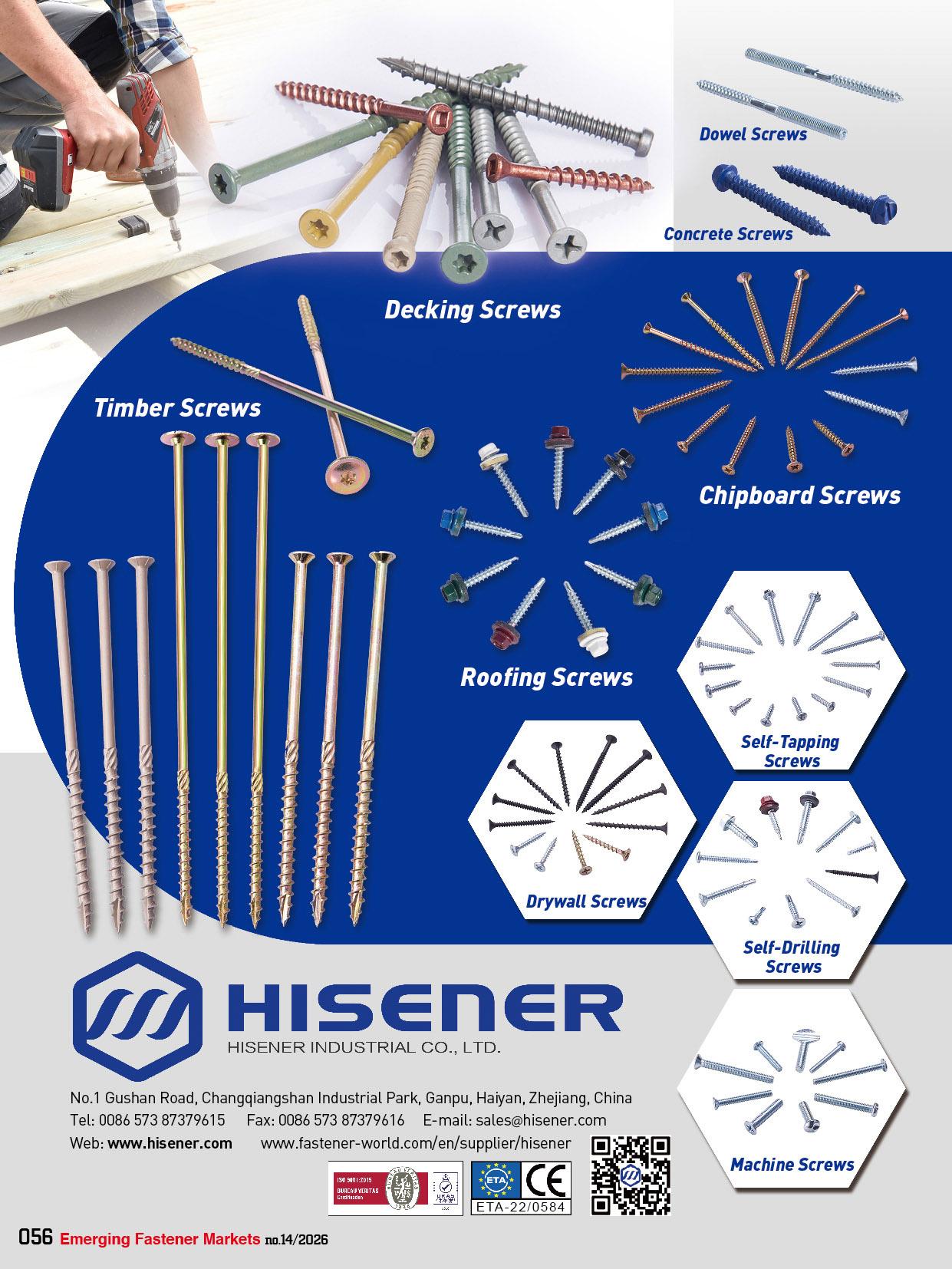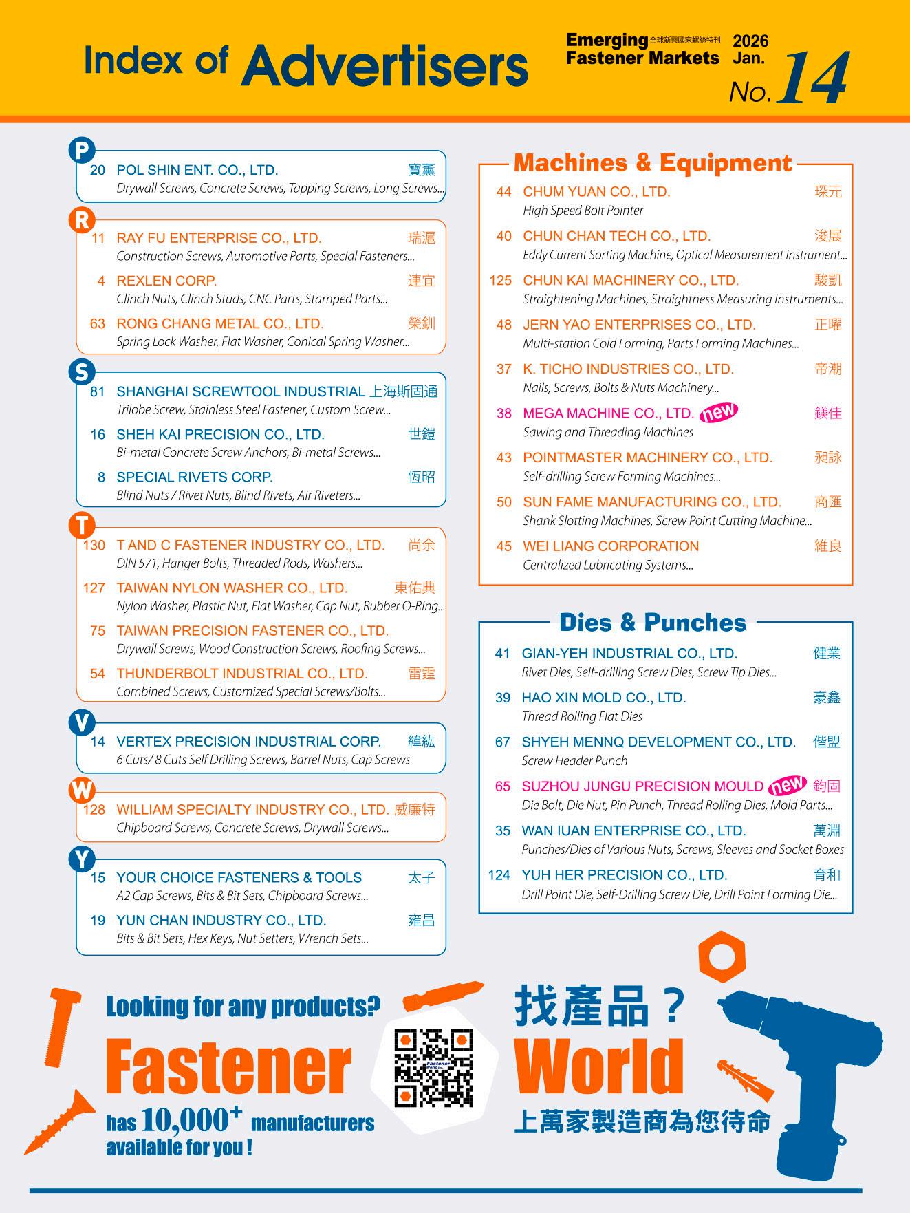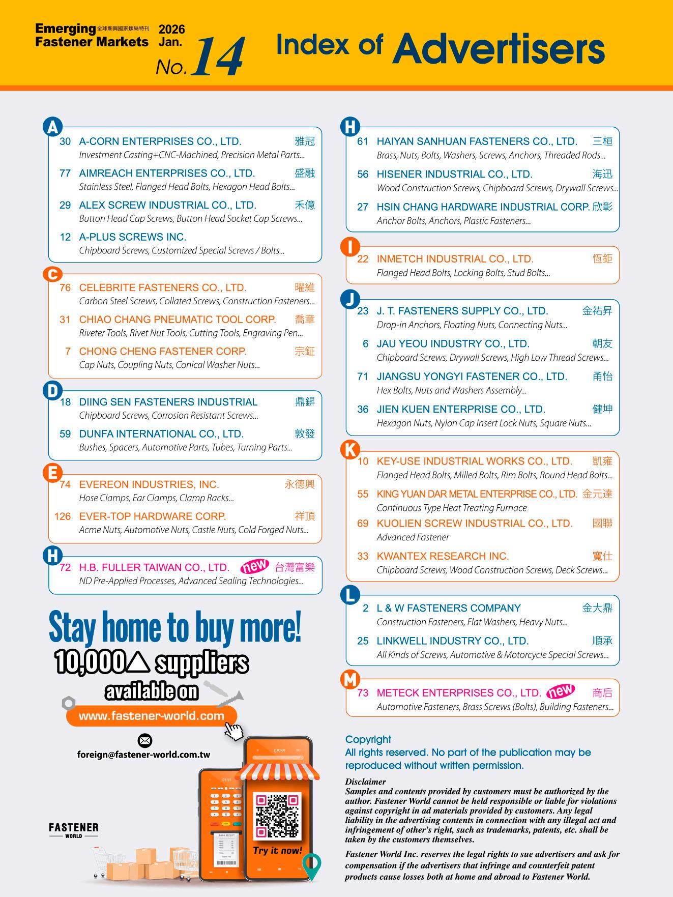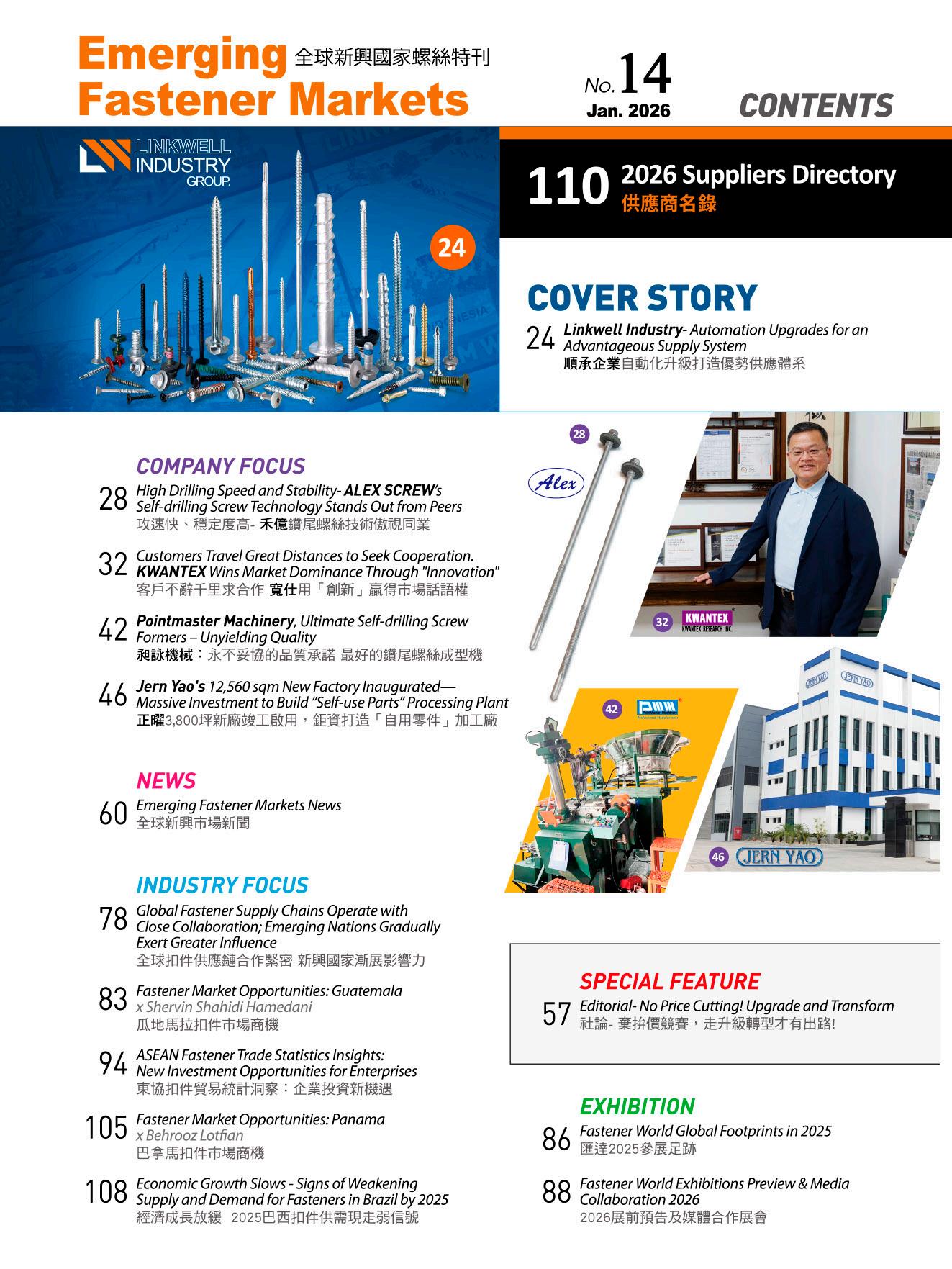 The Jan. 2026 issue of “Emerging Fastener Markets Magazine Suppliers Directory” compiles information on numerous Taiwanese and international suppliers capable of delivering the best value to emerging market users in terms of price, quality, technology, and after-sales service. This includes suppliers of finished fasteners, semi-finished products, wire rods, tools & peripherals, machinery & equipment, and secondary processing services. Comprehensive supplier information will help you quickly source high-quality fastener-related products and match with the most suitable partners.