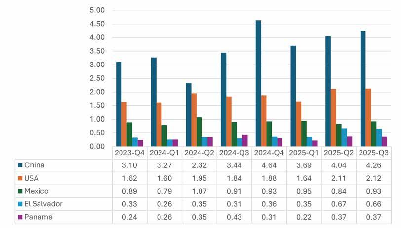 Venezuela has consistently been Panama’s largest export destination, with exports rising sharply from USD 754 thousand in 2020 to USD 4.373 million in 2022 before declining to USD 2.963 million in 2024. This pattern highlights the irregular and projectdriven nature of Venezuelan demand, which is closely linked to infrastructure degradation, replacement needs, and constrained direct access to global suppliers. While Venezuela significantly inflates Panama’s export volumes during active procurement cycles, the volatility of this market limits its reliability as a longterm growth driver.