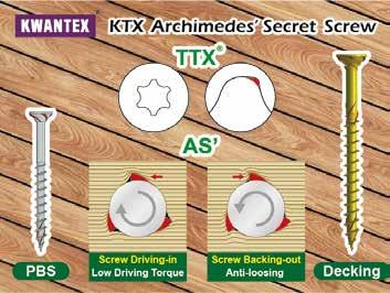 (including the KTX-Torpedo Plastic Decking Screw, which fastens wood surfaces without cracking edges and features reverse threads to prevent mushrooming); the 3rd-generation Archimedes’ Secret Threads (AS’) series (the best alternative to the TY-17, double cut design and Torpedo thread) that can prevent wood cracking without damaging the wood fibers and reducing driving torque, and maintain high pull-out force; the KTX Convex (VK) Head that can replace traditional hex washer heads and prevent slippage and wear after installation (suitable for various steel structure, wood structure, and concrete screws and bolts, which are easy to use with VN nuts); the KTX-Jig (for Hidden Decking Screw System) that can create a clean, fastener-free surface by side fastening, which won the Worldwide Fastener Sources Fastener Innovation Award in 2025; and the stainless steel KTX Terrace (IPE) Screw that can drill into extremely hard wood without pre-drilling and snapping-off.