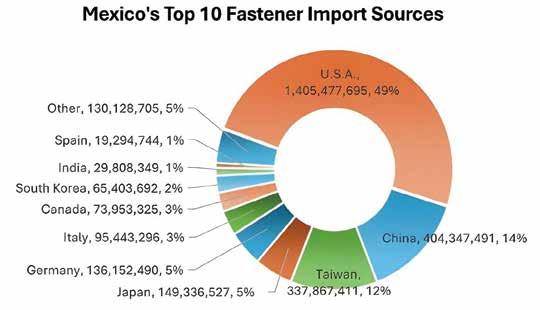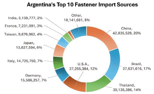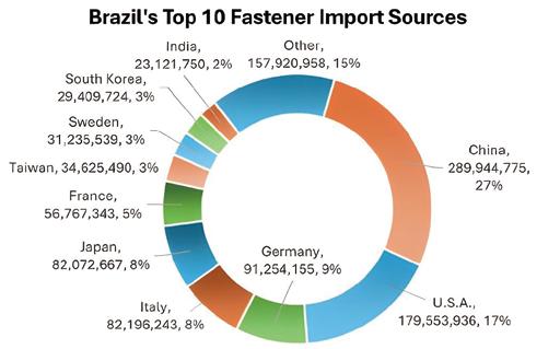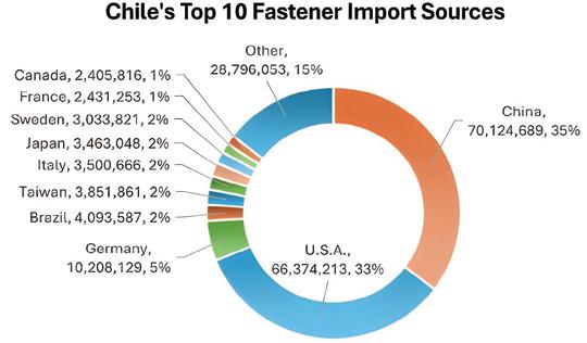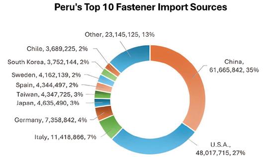 1. In 2024, the top 15 Latin American countries' global fasteners imports totaled USD 4,863,204,949 (refer to Fastener World Magazine Issue 214); the top 5 (Mexico, Brazil, Argentina, Chile, Peru) imported USD 868,918,325 from China, estimating a ~17.8% market share.