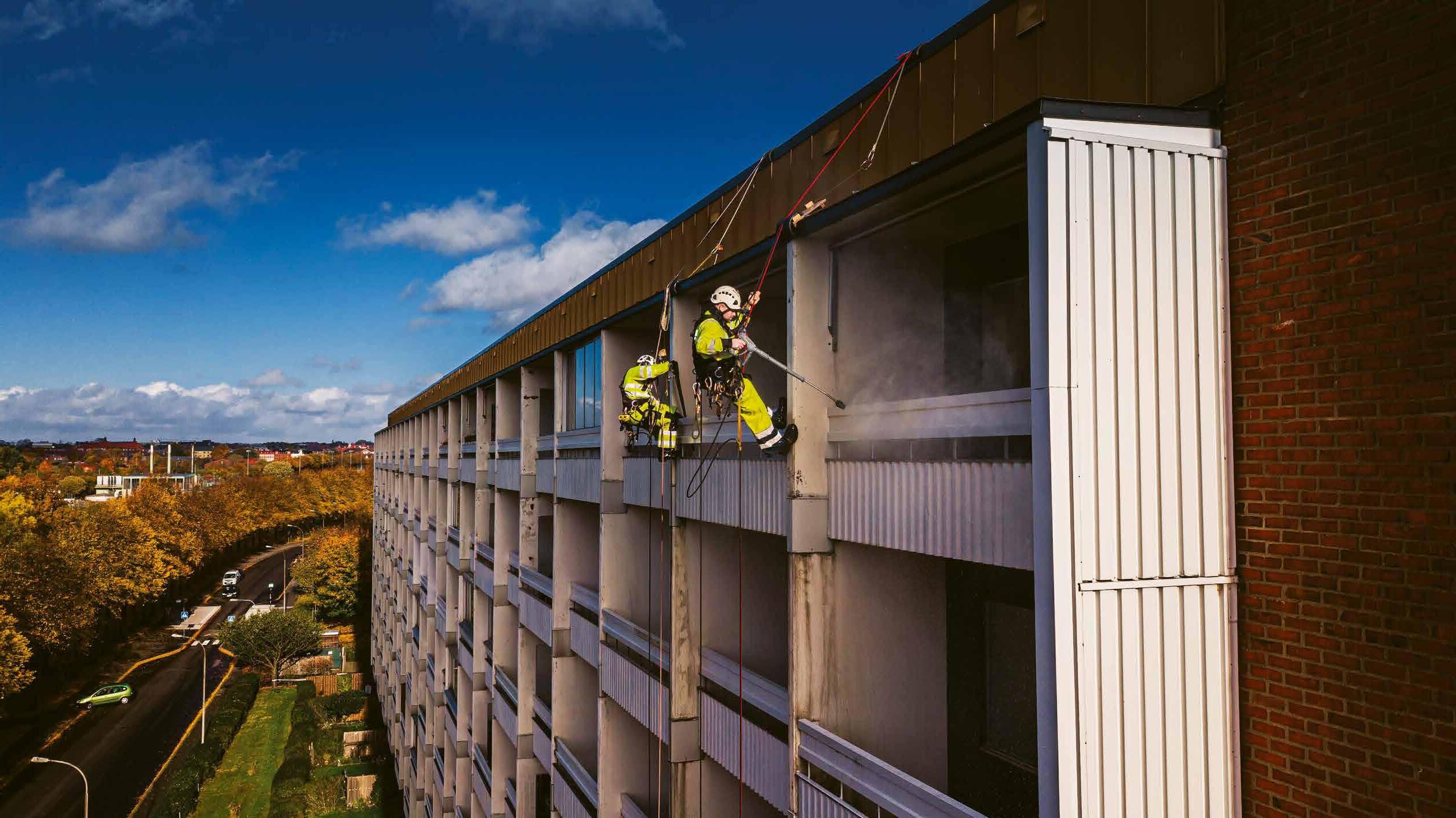 Vår fasadtvättstjänst rengör byggnadens yttre för att förbättra både utseendet och underhållet av din fastighet