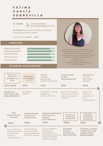 Espacio Público, Paisaje y Arquitectura Participante. Arquitecta orientada al diseño de Paisaje y espacio público. Colaboró con el proyecto CASA Ciudades Amazónicas Auto-sostenibles, y los colectivos AULA y Ocupa tu Calle para diseño de espacios educativos y públicos respectivamente. Se desempeñó como diseñadora de espacio público del equipo Urban 95 Lima en la Gerencia de Desarrollo Social de la Municipalidad Metropolitana de Lima. Y es Coordinadora general del Proyecto “Paisajes Educativos”, que, desde su trabajo en colegios y barrios, busca reconectar comunidades pequeñas con la naturaleza a través de las micro intervenciones de paisaje. Dibujante ocasional. Constante aprendiz de las plantas y la Amazonía.