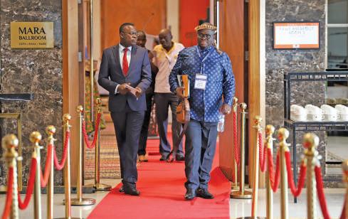 Madzimawe Madzathonya from Zambia (in blue shirt) together with his aids walk into the conference halls.