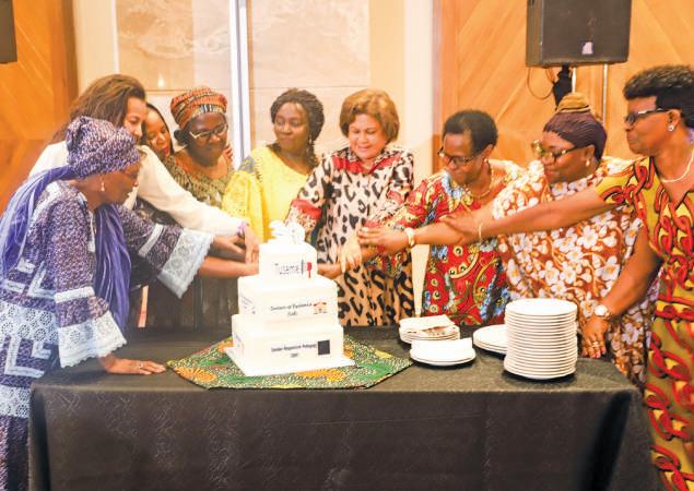 Members of the FAWE Board cut a celebratory cake at the 30th Anniversary of the organization.