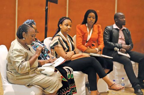 Deputy Minister for Basic and Secondary Education in Sierra Leone Hon. Emily Gogra speaks during a panel discussion held at a parallel session dubbed ‘Education: A Catalyst to Girls and Young Women Taking up Leadership Positions’. Looking on are fellow panelists Dr. Lanoi Parmuat, Executive Director, ENAI Africa, Lydia Madyirapanzi, Executive Director, FAWE Zimbabwe, Meti Gemechu from the Malala Fund and Michael Onguss from International IDEA.