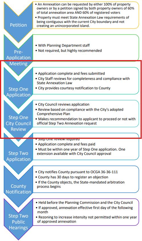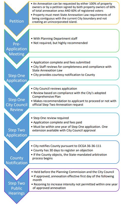 Review of request: A formal review of the request is conducted by city staff and a recommendation is presented to the Planning Commission. They make a recommendation to City Council. City Council makes the final decision to annex property.