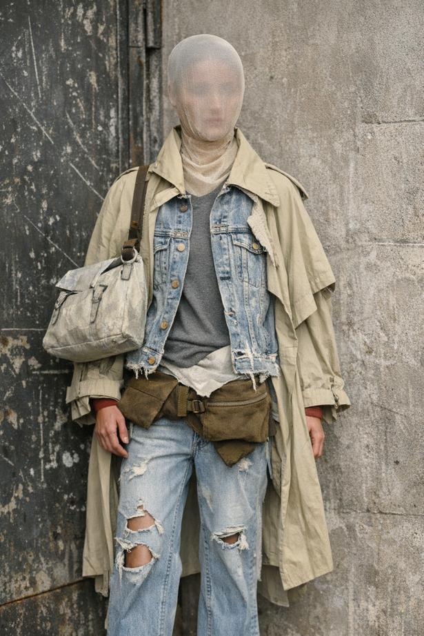 The final images from my shoot capture the exact mood and visual language I set out to build — quiet, coded, and emotionally restrained, yet visually strong. Each look sits naturally within the industrial and urban locations, allowing the textures of metal, brick, and concrete to frame the styling without overpowering it. The layered denim, trench coats, mesh coverings, ties, and sunglasses create silhouettes that feel intentional and slightly withdrawn, reinforcing the themes of ambiguity and self‑possession. The poses — leaning, sitting, reclining, turning away — avoid performance and instead create a sense of stillness within the chaos of the environment. Together, the finals feel cohesive and atmospheric, showing a clear understanding of mood, styling, and space while reflecting the conceptual depth behind the project.