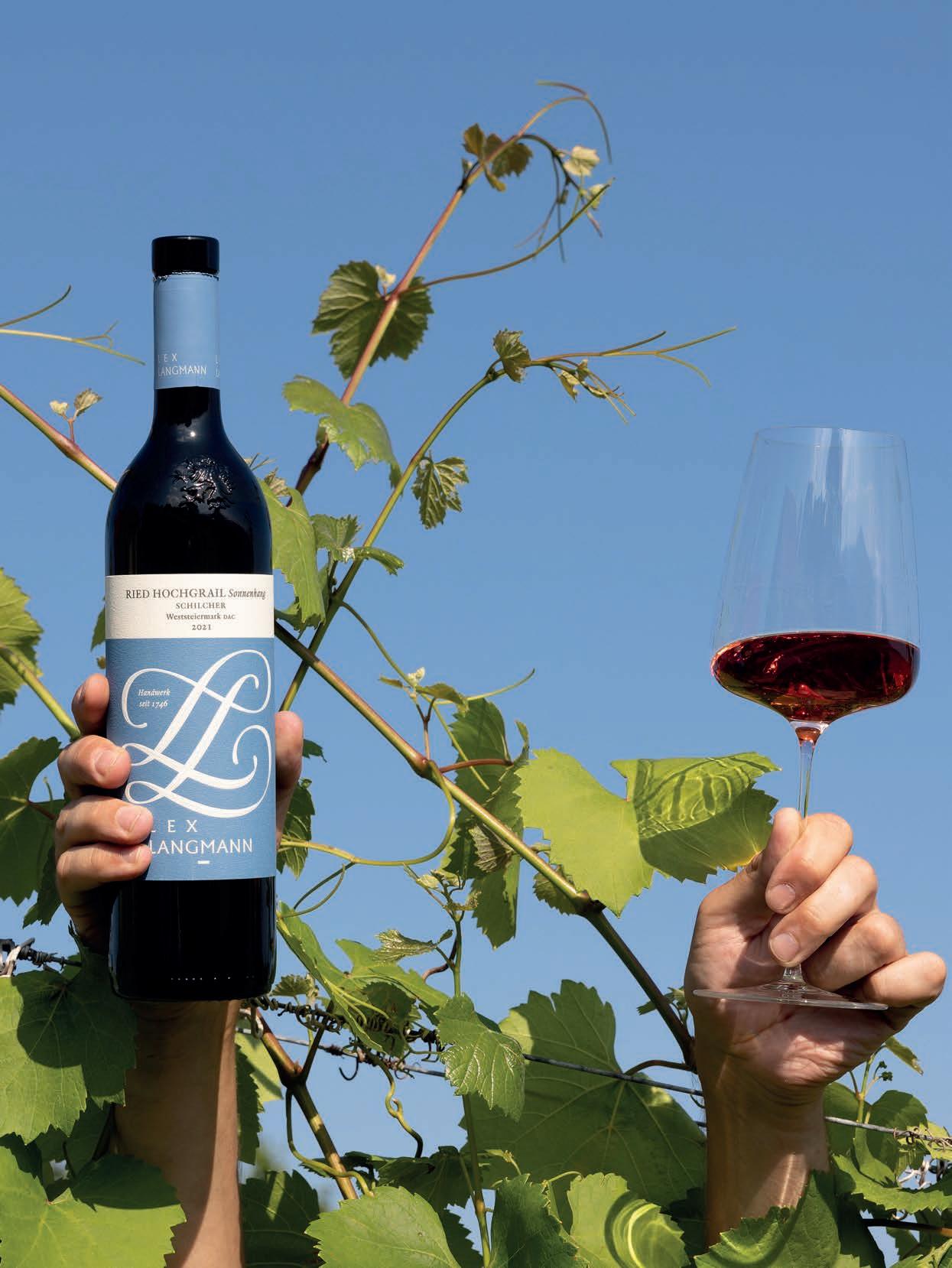 Die breite Langmann-Palette Wer Langmann verstehen will, muss seine Vielfalt begreifen. Denn auch wenn der Blaue Wildbacher das Herzstück des Weinguts bleibt, entstand rund um ihn ein beeindruckendes Sortiment, das die Weststeiermark in all ihren Facetten abbildet. Beim Schilcher beginnt es klassisch: Der Schilcher Junker ist der jugendliche Herbstbote – frisch, fruchtig, sofort trinkbereit. Der Klassik wiederum ist jener archetypische Langmann-Schilcher, der mit straffer Säure, Cassis- und Zitrusnoten zum »Signature«-Wein geworden ist. Darüber rangieren Herkunfts- und Lagenstilistik – vom Stainz Schilcher über die präzise, kühle Mine-
