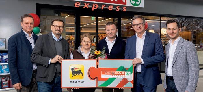 Eröffnung mit (v.l.n.r.) Jörg Bernert (Leiter Vertrieb Einzelhandel), ENI-Gebietsleiter Claus Bergmann, ENI-Pächter Monika und Klaus Zotzek, SPAR-GF Christoph Holzer und SPAR-Gebietsleiter Axel Galli