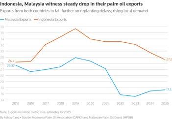 Calculations based on Malaysian and Indonesia palm oil body estimates suggest combined exports are likely to drop to about 37 million metric tons by 2030, down by a fifth since 2024.