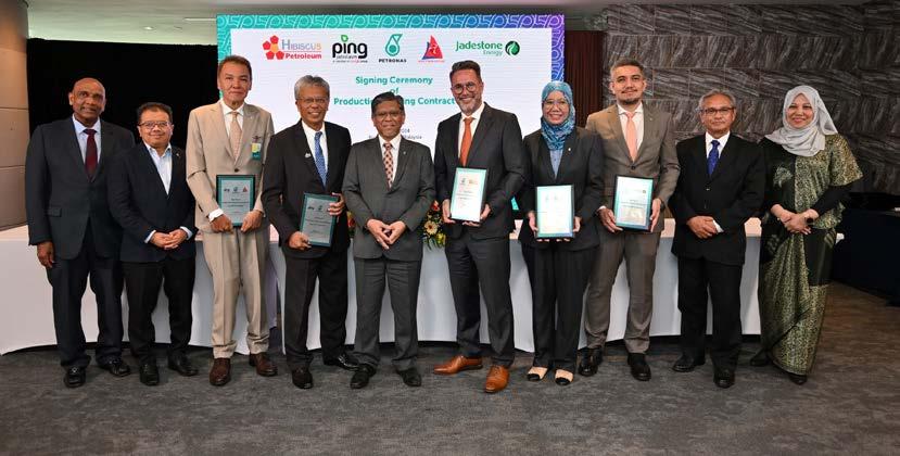 SVP of MPM, PETRONAS, Datuk Ir. Bacho Pilong (5th from left) with signatories and representatives from PCSB, Hibiscus Oil & Gas Malaysia Limited, Ping Petroleum, Duta Marine and Jadestone Energy at the signing