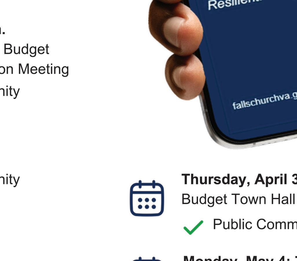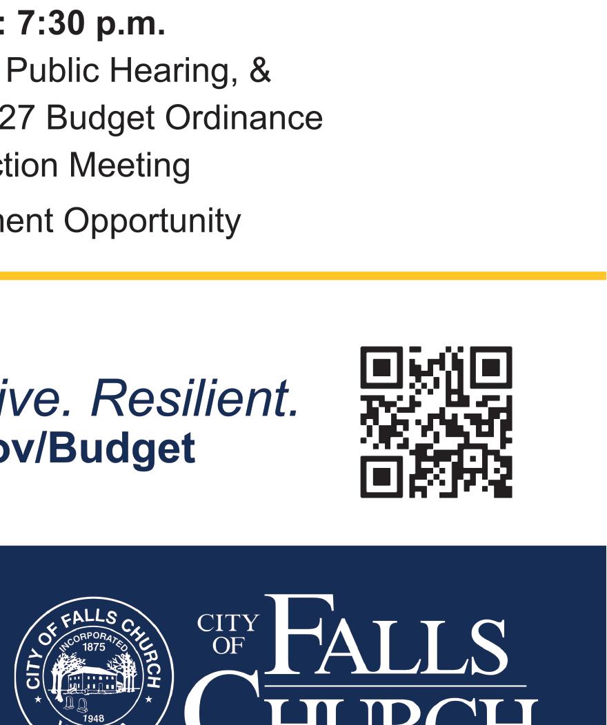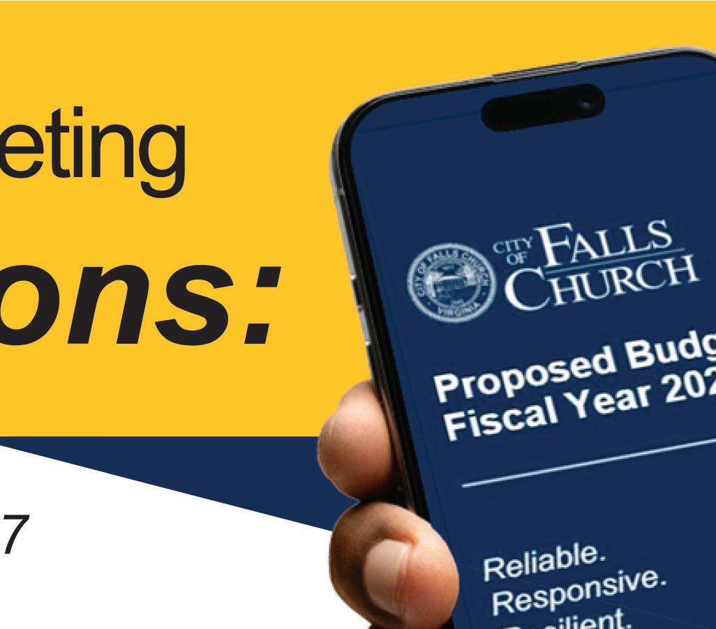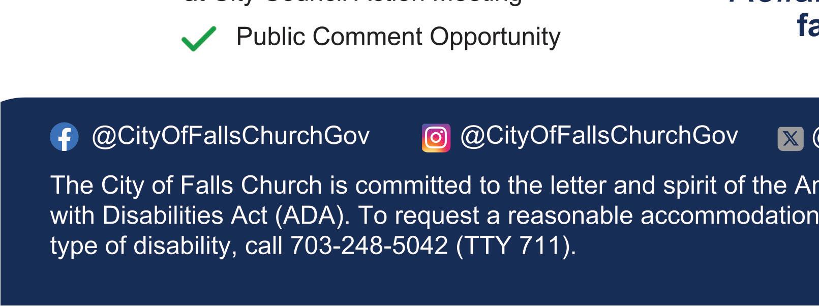 Public comment sign-up at fallschurchva.gov/publiccomment. Also viewable at fallschurchva.gov/ CouncilMeetings and on FCCTV.