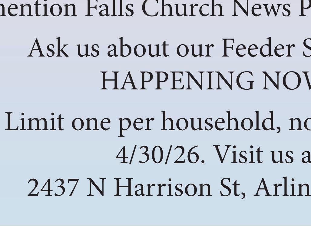 The News-Press is certified by the Commonwealth of Virginia to publish official legal notices including probate, abc notices, small and foreign estates. We will provide the appropriate paperwork. A comprehensive book on the 36 year history of the News-Press, “The Life and Times of the Falls Church NewsPress”: by Charlie Clark (History Press, 2023), can be purchased at local bookstores or online. The Falls Church News-Press is published weekly on Thursdays and is distributed free of charge throughout the City of Falls Church and the Greater Falls Church area to over 140 locations. Offices are at 105 N. Virginia Ave., #310, Falls Church, VA 22046. Reproduction of this publication in whole or part is prohibited except with the written permission of the publisher. ©2025 Benton Communications Inc. The News-Press is printed on recycled paper. A searchable archive of all issues of the Falls Church News-Press since 1991 can be found at bit.ly/44kt6Sc.