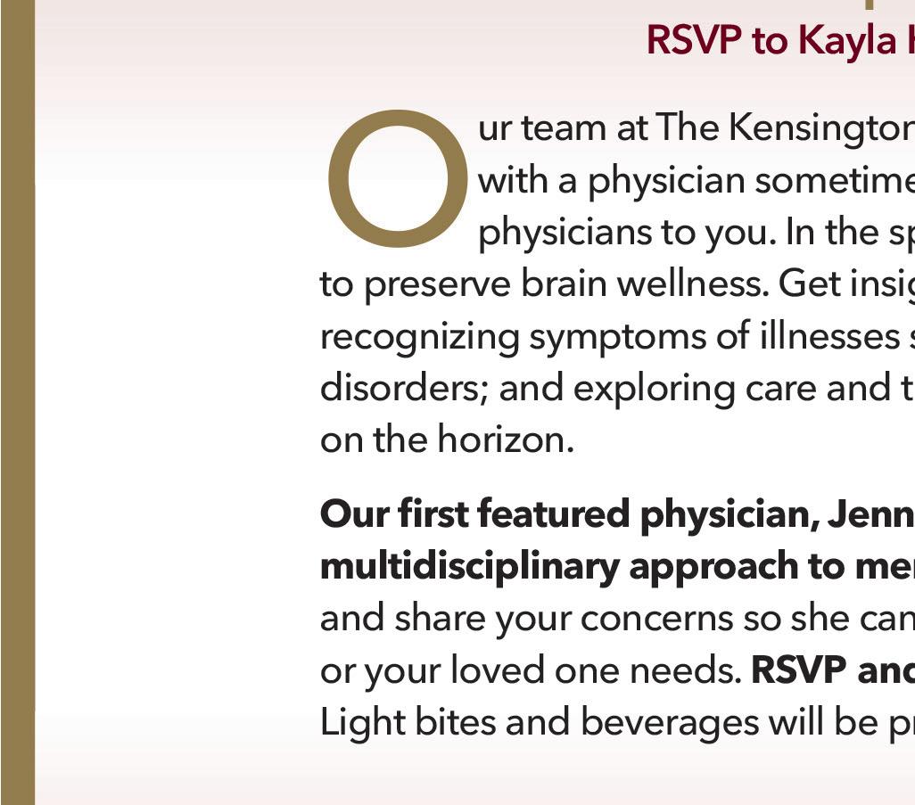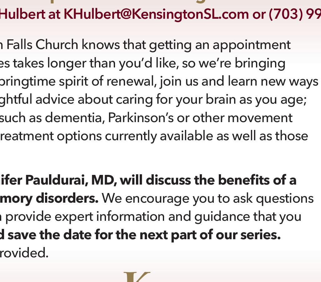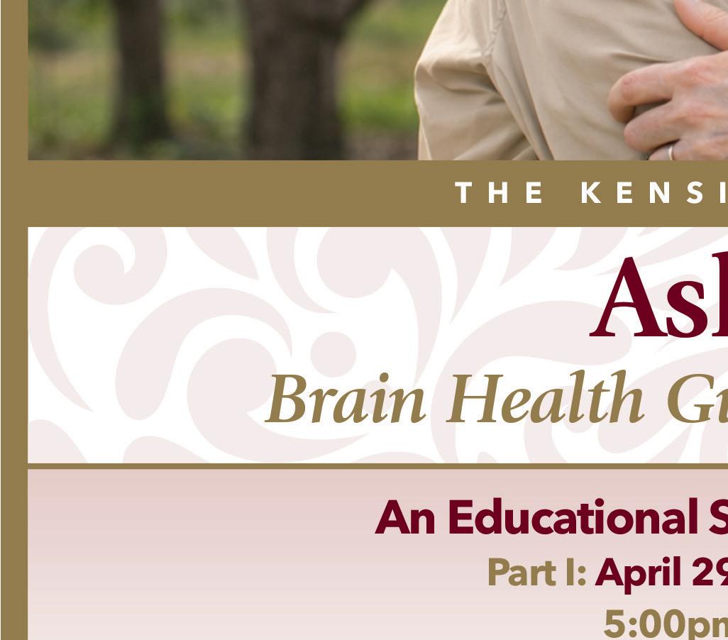 Kensington kicks off Parkinson’s Awareness Month with a practical conversation on brainhealthy eating with nutrition coach Sabina Kelly of Future You Nutrition. During this session on Saturday, April 4, 11:00 am – 12:00 pm, Sabina will introduce two evidence-informed dietary approaches — the MIND diet and the PRO-21 diet — and discuss how these nutritional frameworks may support cognitive health, energy levels, and overall wellness for individuals living with Parkinson’s and other neurological conditions. Participants will learn realistic, sustainable strategies that make healthy eating approachable and achievable to support brain health and build habits that promote long-term well-being. RSVP to Kayla Hulbert, khulbert@kensingtonsl.com.