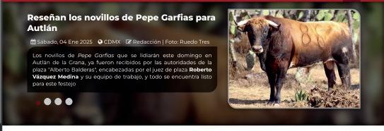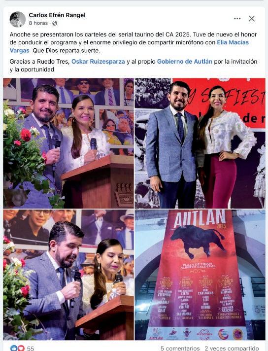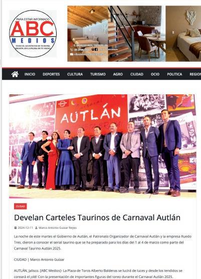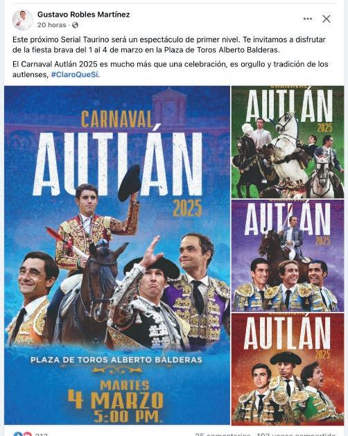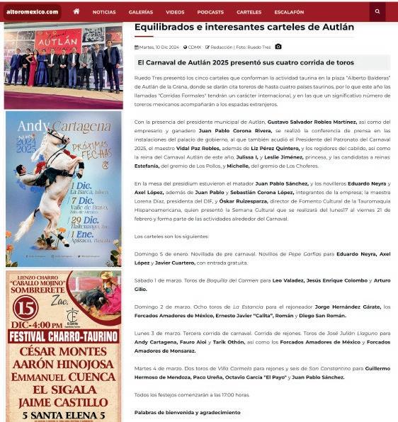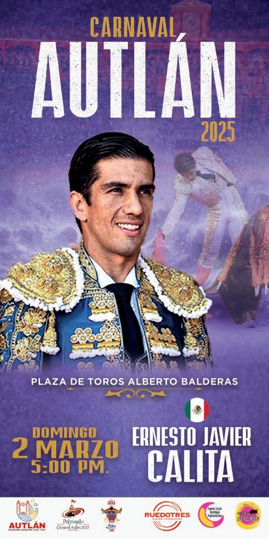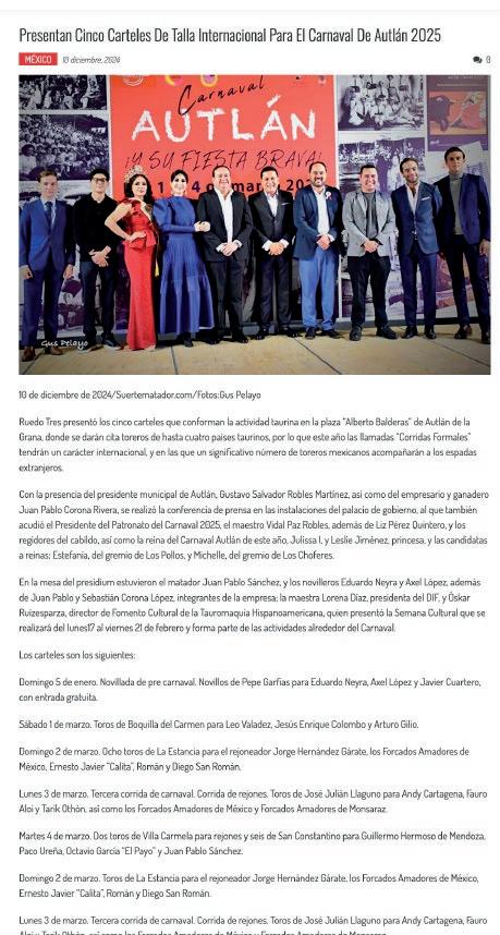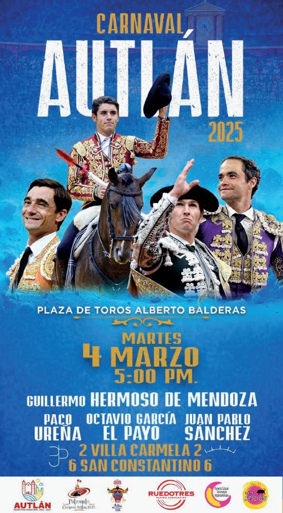 “Quiero expresar un sincero reconoci miento y admiración a la empresa Rue do Tres por su dedicación a la difusión de la tauromaquia, nos ha permitido llevar a un serial taurino muy relevante, cuyos carteles son dignos de las mejores plazas de México, y estamos agradecidos a esa pasión por los toros y transmitir esta cultura. Así que aquí los esperamos con la hospitalidad y la alegría que nos caracteriza a los autlenses”, dijo el presidente del Patronato del Carnaval 2025, el maestro Vidal Paz Robles.