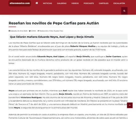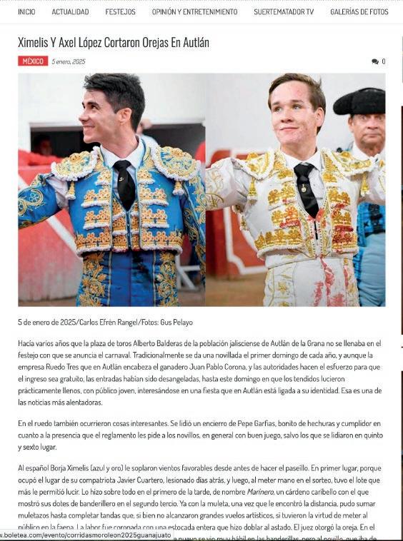 “Me encuentro muy agradecido con el apoyo incondicional que me brinda don Juan Pablo Corona y la oportunidad de volver a torear en Autlán, tal y como lo hice el año anterior. En la novillada del 5 de enero espero poder demostrar los avances que he tenido a lo largo de todo el año”, señaló Axel López