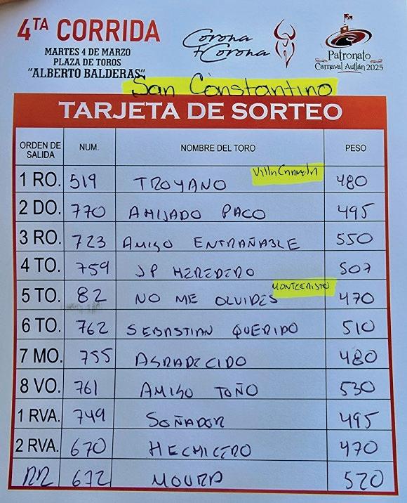 DEL CARNAVAL TAURINO 2025 DE AUTLAN DE LA GRANA ASIGNADOS