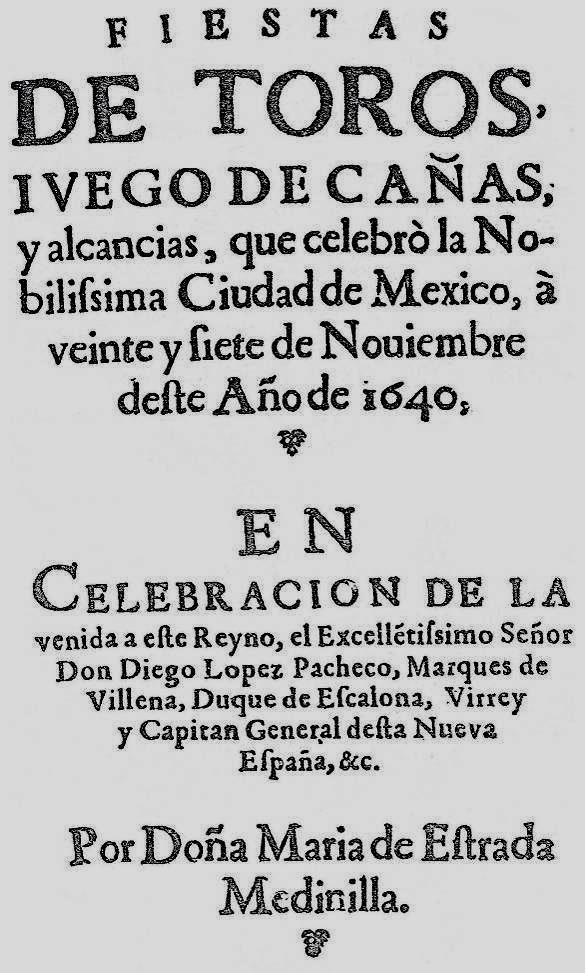 6.-INTRODUCCIÓN, ESTUDIO Y REPRODUCCIÓN FACSIMILAR A LAS FIESTAS DE TOROS, JUEGO DE CAÑAS, y alcancías, que celebró la Nobilísima Ciudad de México, a veinte y siete de Noviembre de este Año de 1640 EN CELEBRACIÓN DE LA venida a este Reino, el Excelentísimo Señor Don Diego López Pacheco, Marques de Villena, Duque de Escalona, Virrey y Capitán General de esta Nueva España, &c. Por Doña María de Estrada / Medinilla.