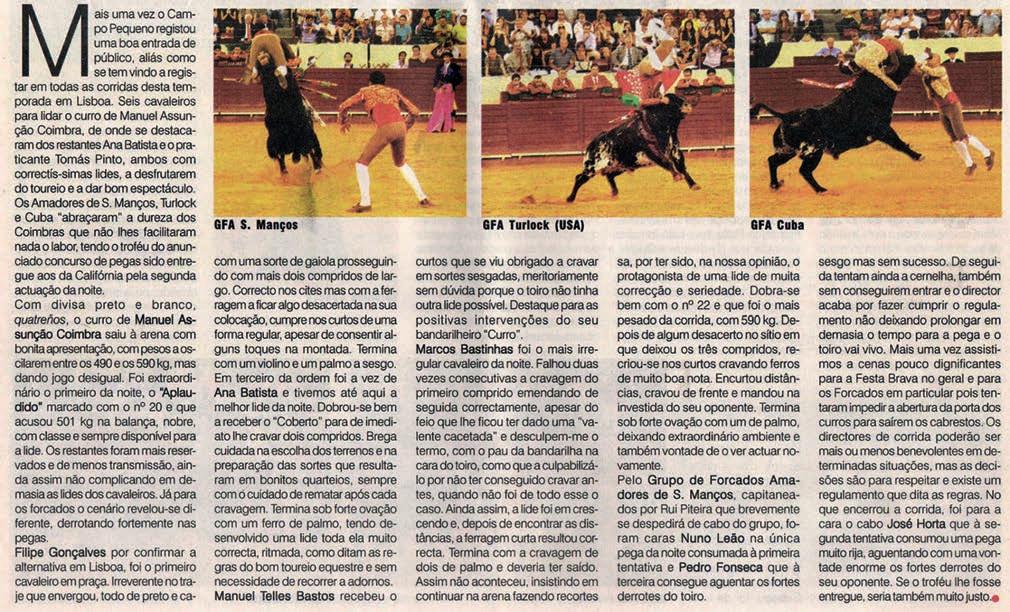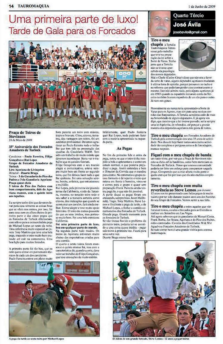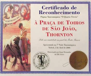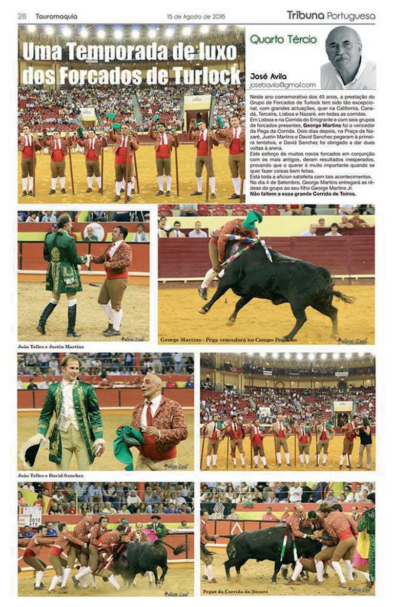 The Grupo de Forcados Amadores de Turlock, after their great triumph in 2009, when they won the prize for best “pega”, at the PraçaMonumentalofCampoPequenoinLisbon,betweenthreegroups, seven years later, on August 4, 2016, they return to the same place and win, once again, the award for best “pega”, but this time with the unanimity of the three members of the jury and an added difficulty, the disputebetweensixforcadogroups.Itwasacrownofgloryontopofthe previousachievement.