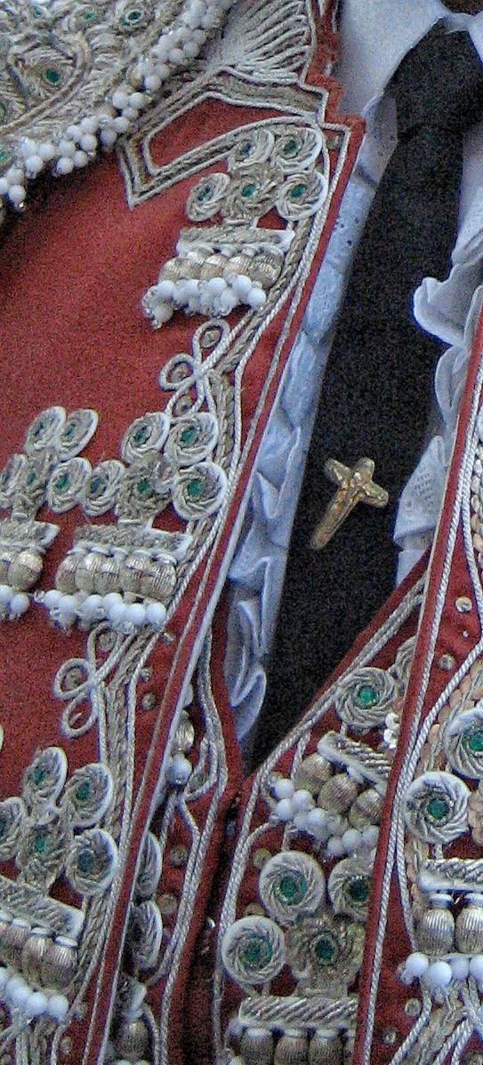 el mismo diestro bordaba una cruz sobre el corbatín con hilo y aguja para sujetarlo. Ahora sólo abrochan una medalla de oro, ojalá y no se sigan perdiendo los detalles del ritual de vestirse de luces, como este.