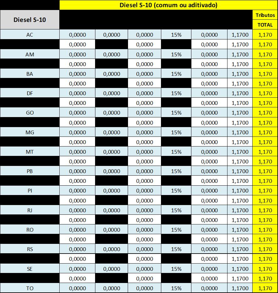 ✓ Os valores do PIS/COFINS para o óleo diesel B (S500 e S10) correspondem a 85% (em razão da presença de biodiesel na proporção de 15%), dos valores previstos na Lei 10.865/2004, incidentes sobre o óleo diesel A (igual a ZERO até 31/05/2026 –conforme Decreto 12.875/2026) CIDE – valor “zerado” para óleo diesel, desde 30/05/2018, conforme Decreto 9391/2018, mais o percentual de 15% dos valores do PIS/COFINS incidentes sobre o biodiesel, previstos na Lei 11.116/2005 e Decreto nº 10.527/2020 (igual a ZERO até 31/05/2026 – conforme Decreto 12.923/2026)