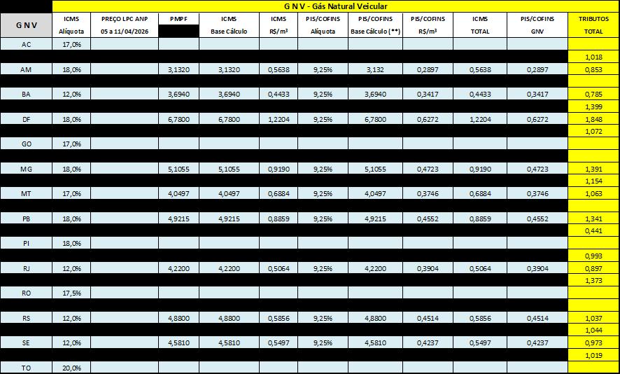 (*) ➔ para os estados que não informam valores para o PMPF (PE/SP), foram considerados como base de cálculo do ICMS os preços médios de venda ao consumidor do Levantamento de Preços de Combustíveis da ANP. Nesses estados é utilizado o MVA no cálculo do ICMS. O Estado de Pernambuco tem um incentivo fiscal, não é retido o ICMS da substituição tributária para o GNV (Lei 14.956/2013)