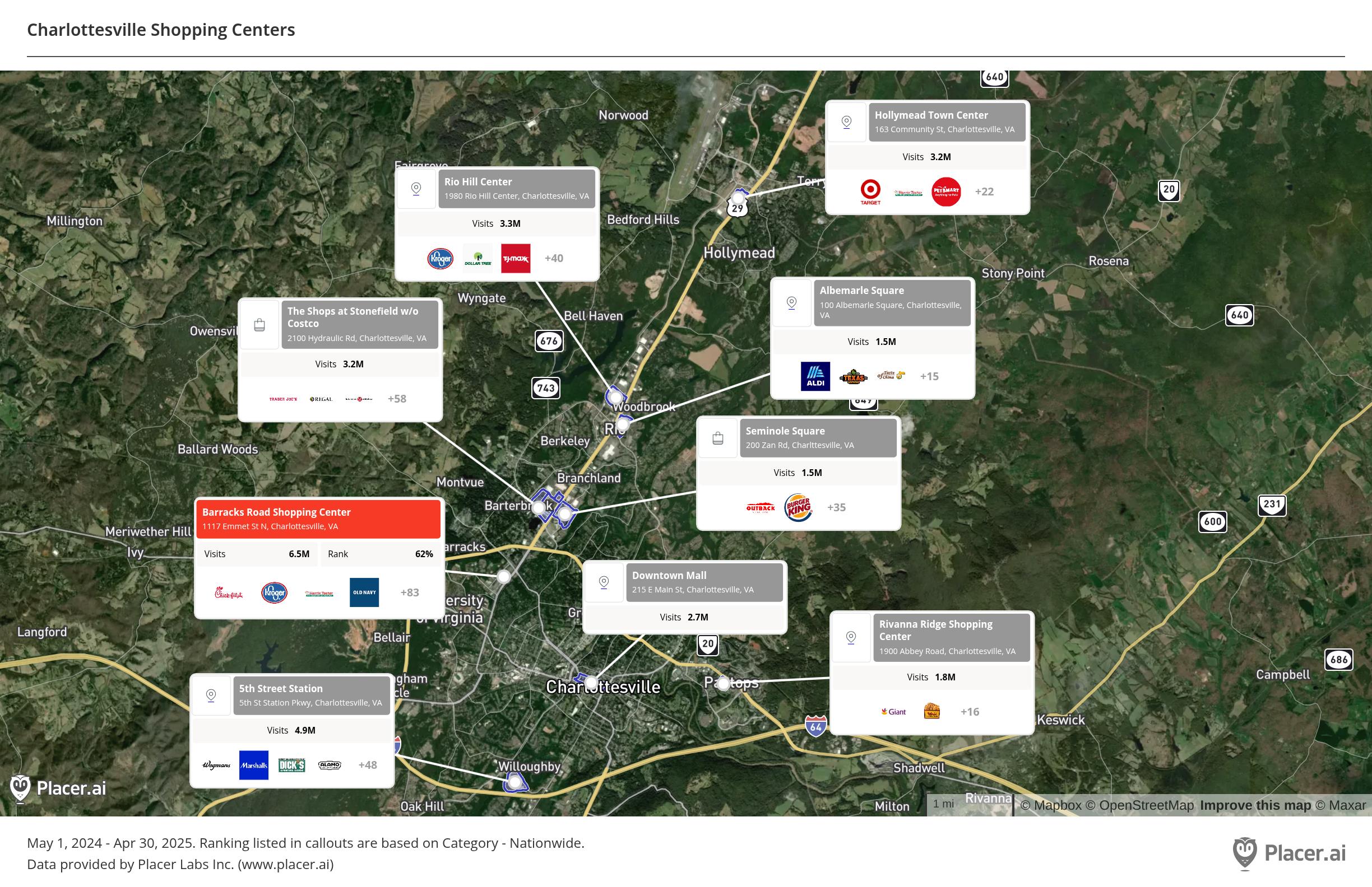 Established in 1959, Barracks Road is the most visited shopping destination in Charlottesville, attracting 6.5 million annually. The center features a dynamic mix of national retailers and independent shops and restaurants, drawing a wide regional audience of residents and visitors.