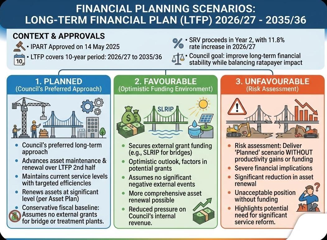 Council is proceeding with the final year of the Special Rate Variation (SRV) that will increase general rates by 11.8% in 2026/27. This follows the Independent Pricing and Regulatory Tribunal's (IPART) approval on 14 May 2025, which recognised the Council’s need for improved financial sustainability while balancing the impact on ratepayers1. To ensure long-term stability, this Long-Term Financial Plan (LTFP) models three primary scenarios for the period 2026/27 to 2035/36: