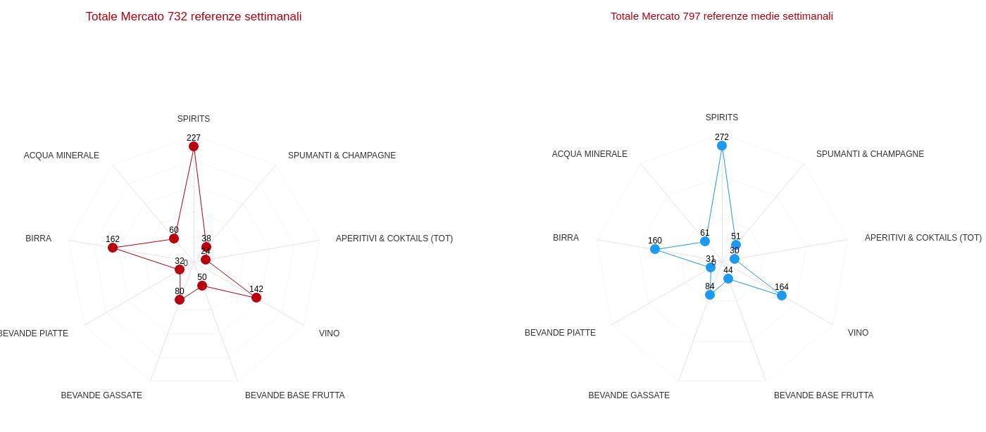 BIRRA ACQUA MINERALE SPIRITS VINO BEVANDE GASSATE APERITIVI & COKTAILS (TOT) SPUMANTI & CHAMPAGNE BEVANDE PIATTE BEVANDE BASE FRUTTA 0,4% 6,4% 43,7% 16,6% 21,3% 55,5% 27,3% 12,2% 2,9% 15,9% BEVANDE BASE FRUTTA BEVANDE PIATTE SPUMANTI & CHAMPAGNE APERITIVI & COKTAILS (TOT) VINO SPIRITS BEVANDE GASSATE ACQUA MINERALE BIRRA TOTALE MERCATO