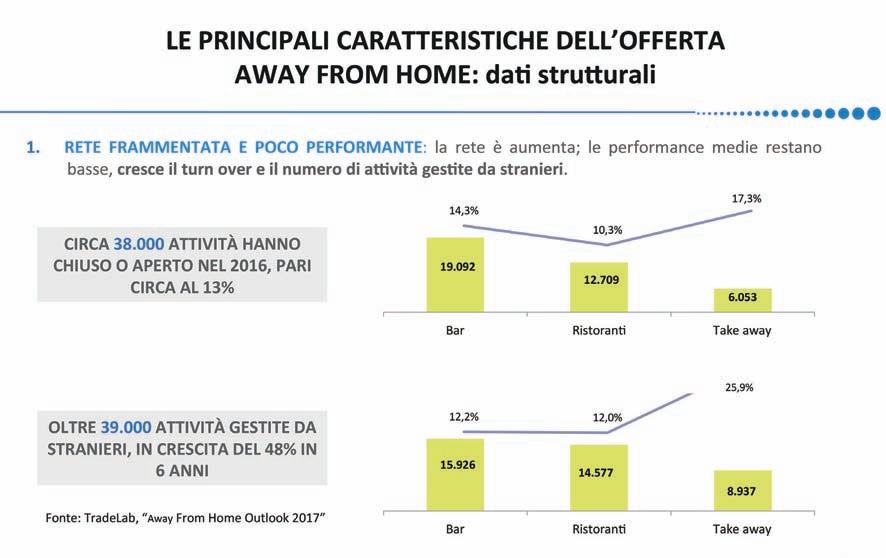 Nel 2017 circa 3 milioni di italiani hanno consumato pasti pronti consegnati a casa o sul luogo di lavoro dalle società di food delivery, per una spesa di 267 mi lioni di euro4. Si tratta di un fenomeno da analizzare non tanto nelle sue conno tazioni quantitative, ad oggi pari allo 0,3% di quota di mercato dell’intero settore del consumo fuori casa, quanto piuttosto per le derive esperienziali che espri me. È un po’ come se l’italiano promuovesse le capacità funzionali dei pubblici esercizi bocciandone, però, le caratteristiche esperienziali. Si tratta dell’emer sione di una sostanziale inadeguatezza relazionale del pubblico esercizio che, frammentato e chiuso all’innovazione, ha esasperato l’ipertrofia funzionale, la cosiddetta “professionalità”, perdendo di vista il senso ultimo della sua esistenza, quell’essere genius loci del buon vivere.