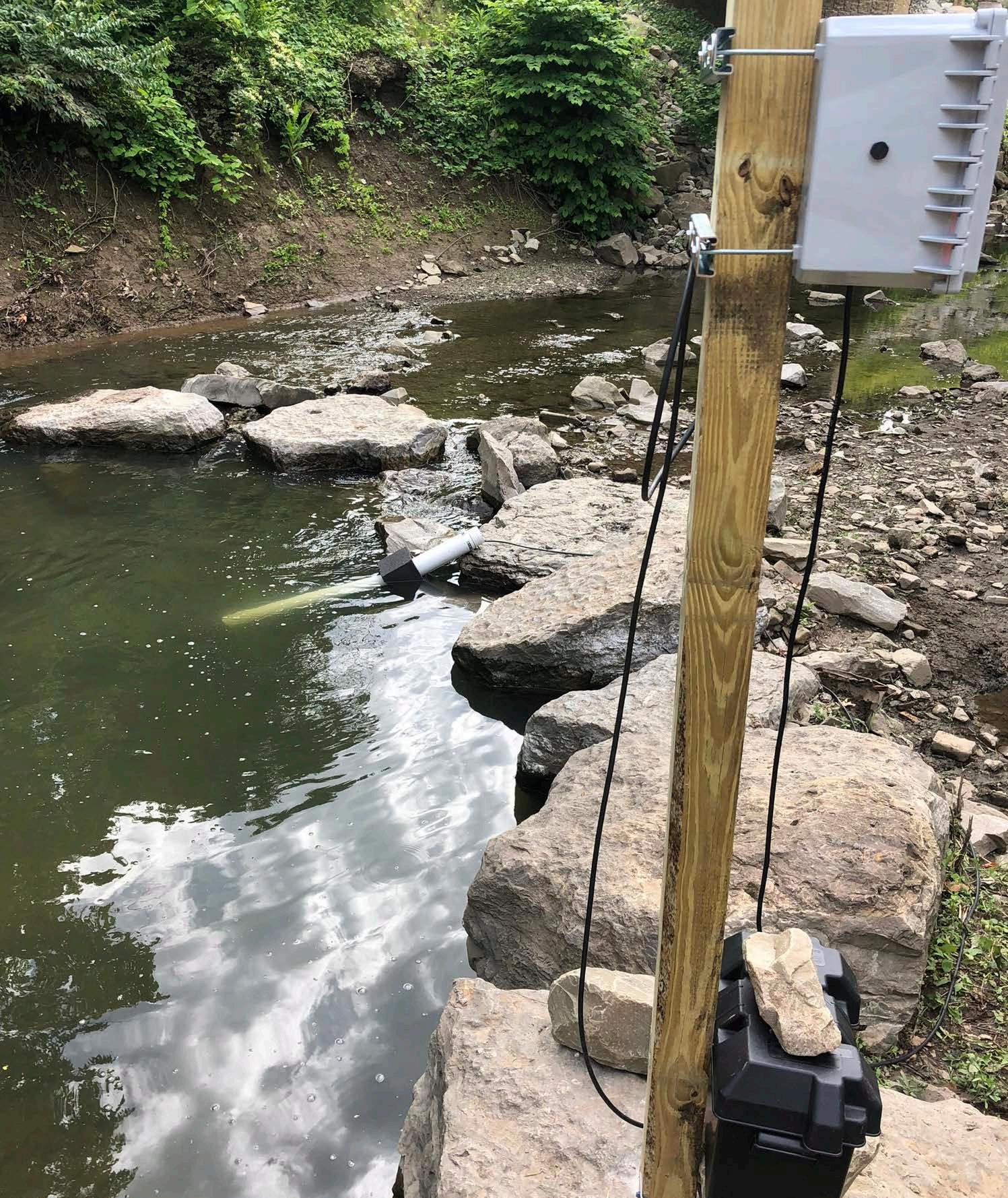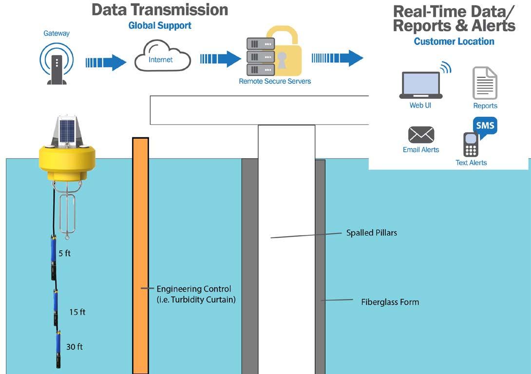 At FDS’s headquarters in Pittsburgh. PA, The FDS Data Manager coordinated the start and stop of field activities each day with the quality control engineer on site. Although the monitoring system was active during all work activities, specific attention was given to periods of concrete placement and other tasks that could increase turbidity. Turbidity thresholds were established based on work plan criteria. Those thresholds (i.e., 10 NTU above background,) were programmed into the application. Text and email notifications were sent automatically if any criterion was exceeded. FDS also monitored failures in communication gear and the system.
