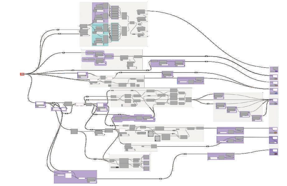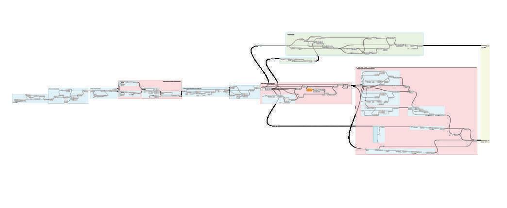 Managing data trees, branch paths, partitioning and adding lists to lists, culling patterns and indexes, merging and entwining lists were the most work of the script to create the overlapping polylines. Cutting them off at certain overlapping so that they aren’t visible as a simple parallelogram pattern, and lofting the end lines of each membrane finished this script. Many more programmatically steps are involved but aren’t worth noticing as they are basic script partaking in every step of using grasshopper.